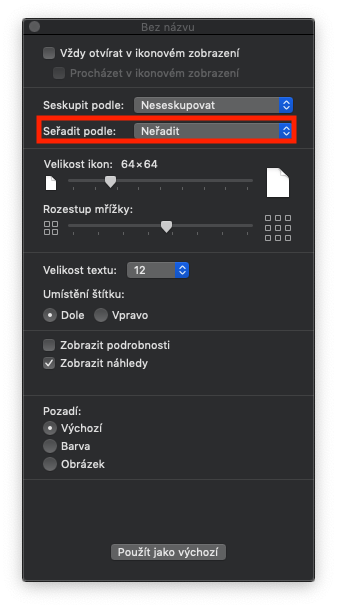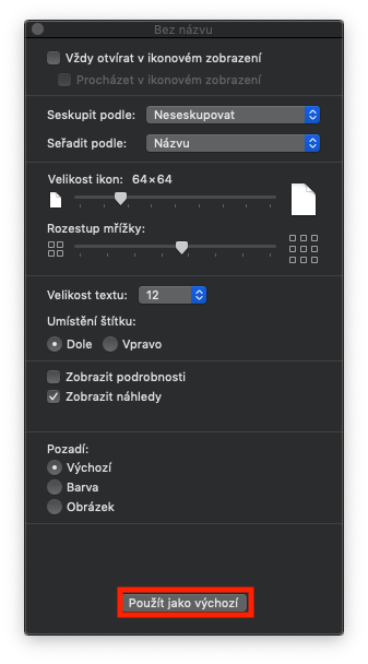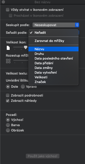 Pokud chcete pevně aplikovat nastavení zobrazení a řazení souborů ve složkách, tak se přepněte do jakékoliv složky ve Finderu. Poté v horní liště rozklikněte možnost Zobrazení a z rozevíracího menu, které se zobrazí, vyberte ve spodní části možnost Volby zobrazení. Otevře se nové okno, ve kterém už si stačí navolit zobrazení, řazení, seskupování a další nastavení podle svého gusta. Já jsem si osobně změnil pouze seřazení souborů z Neřadit na Název. Jakmile provedete všechna nastavení, která chcete aplikovat, tak už pouze stačí kliknout ve spodní části okna na Použít jako výchozí. Po kliknutí na tohle tlačítko dojde v celém systému macOS k aplikování navolených změn, a to ve všech složkách, i u těch, které byly vytvořeny už v minulosti.