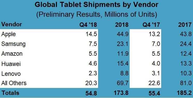 Obecně se dá o loňském roce hovořit co se týče prodejů iPadů jako o úspěšném. Kalifornskému gigantovi se totiž podařilo dle Strategy Analytics prodat na 44,9 milionů kusů jeho tabletů, což je o 1,1 milionu kusů více než v roce 2017 a to i přesto, že meziročně prodeje tabletů poklesly o 11,4 milionu kusů.