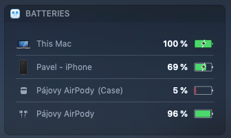 Kliknem si na Bluetooth na lište hore, prejdem myšou na moje airpody a vidím batériu 💁🏼♂️