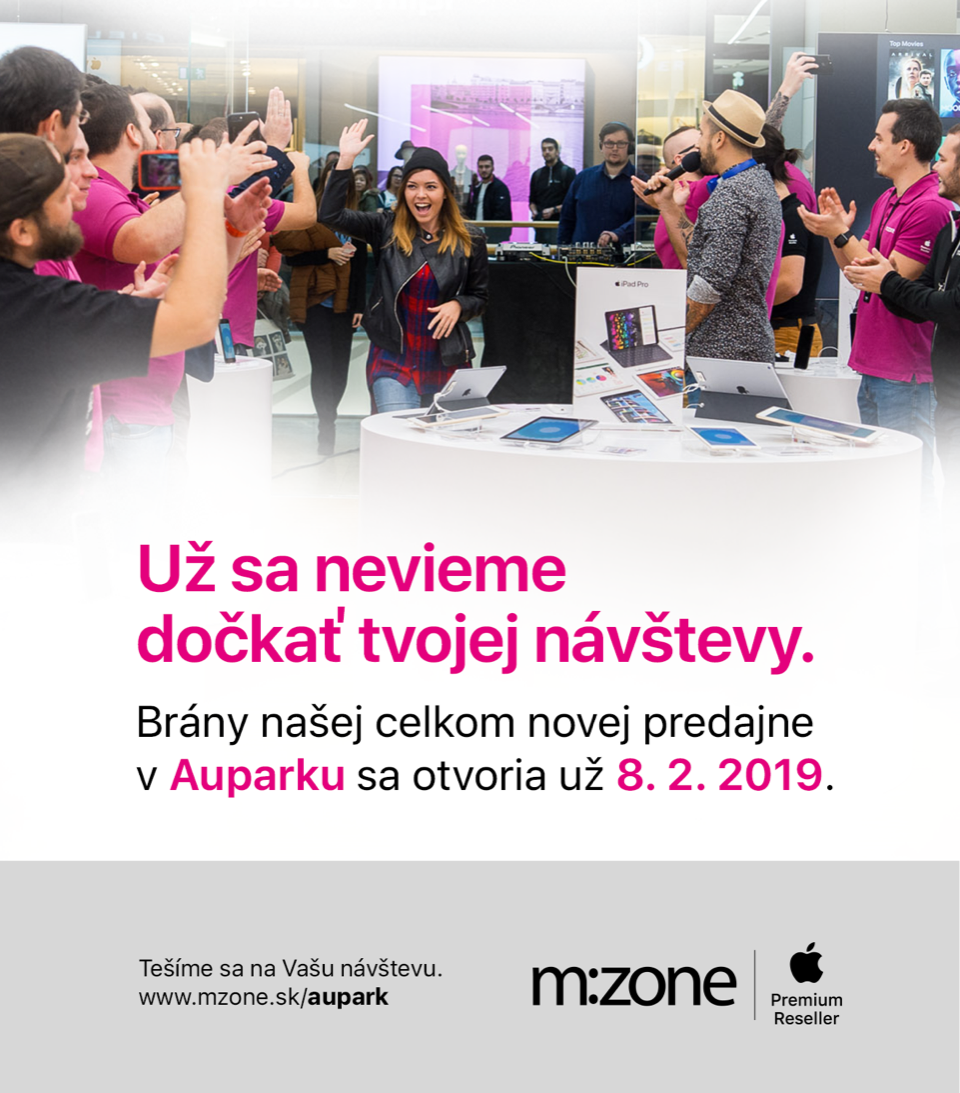 V bratislavském Auparku proběhne již v pátek 8. února slavnostní otevření nové pobočky m:zone. Návštěvníky jedinečné akce čeká plno překvapení, soutěží a výhodných nabídek, v jejichž rámci mohou zakoupit Apple produkty za výrazně lepší ceny. Je libo iPhone XS se slevou až 110€, nový MacBook Air s Retina displejem se slevou až 250€, nebo soutěž o dron DJI Spark či AirPods?