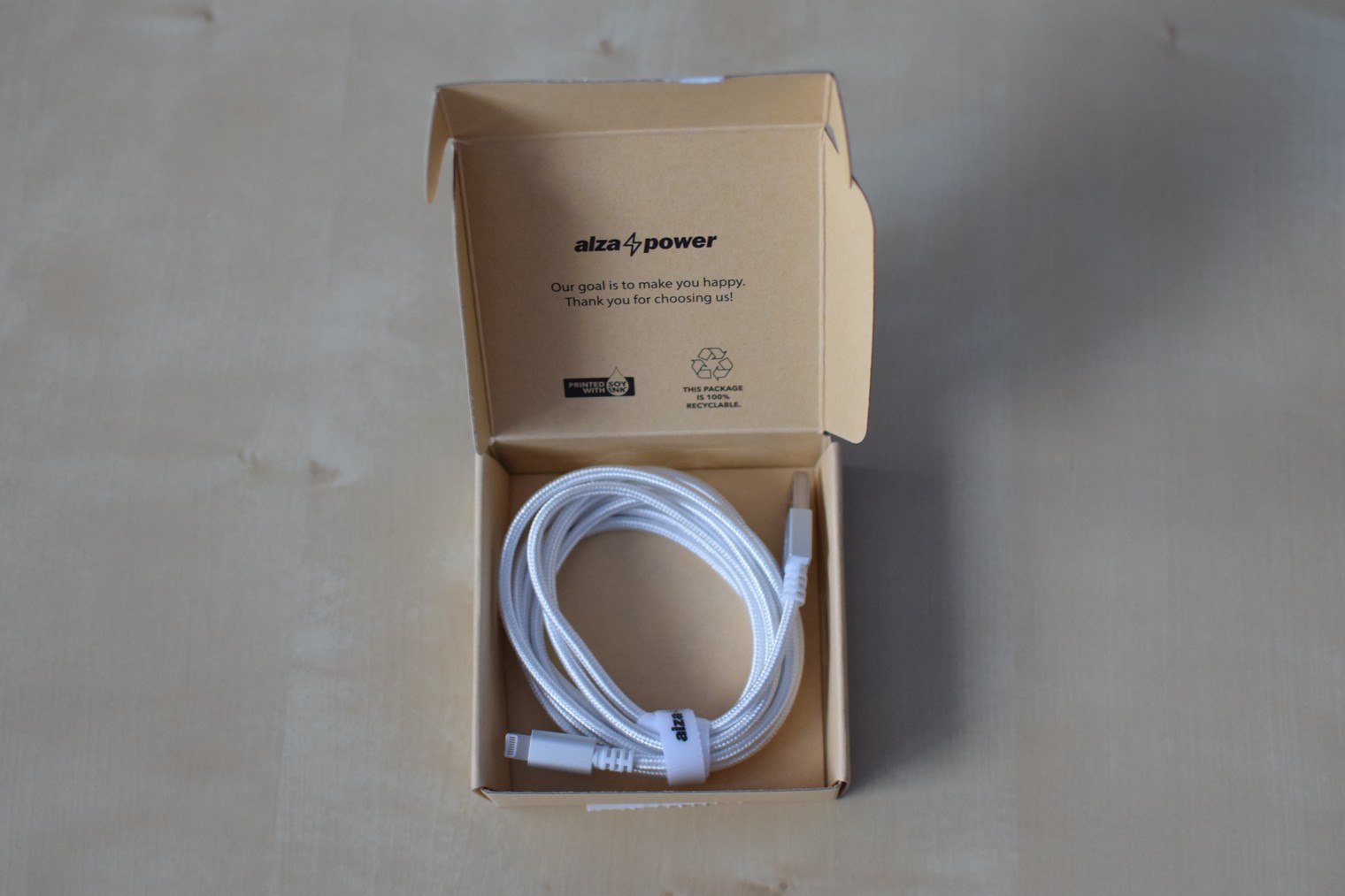 Je mi jasné, že si Lightning kabel nikdo z nás nekupuje kvůli hezké krabičce. U té “alzácké” se však přesto musím zastavit. Je totiž zpracovaná skutečně velmi pěkně a hlavně z recyklovaného papíru, tedy s důrazem na šetrnost k životnímu prostředí, za což u mě má Alza velké plus. Přestože nejsem žádným velkým “bio-eko” fanatikem, podobné obaly mi přijdou moc fajn a trochu mě mrzí, že se s nimi nesetkávám u více produktů. Parádu totiž udělají minimálně stejnou, jako obaly z plastu, igelitů či různě potisknutých lesklých papírů. Jak už jsem však psal na začátku tohoto odstavce, krabička je zřejmě to poslední, co budete při nákupu nového kabelu řešit.
