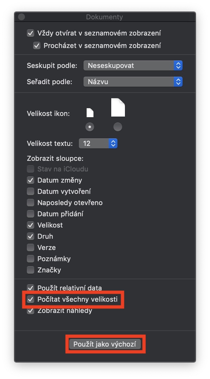 Nejprve se na našem Macu přesuneme do aktivního okna aplikace Finder. Poté v horní liště klikneme na položku Zobrazení. Ukáže se rozevírací menu, ve kterém klikneme ve spodní části na možnost Volby zobrazení. Otevře se nové okno, kde už stačí zaškrtnou možnost Počítat všechny velikosti. Zároveň si samozřejmě můžete zvolit i jiné položky, které vám jsou sympatické. Pokud chcete toto nastavení aplikovat pouze pro aktivní složku, tak stačí okno s volbami zavřít. Pokud však chcete, aby se nastavení aplikovalo pro všechny složky, tak musíte ve spodní části kliknout na tlačítko Použít jako výchozí. Tímto se nastavení aktivuje pro celý Finder. Poté můžete okno zavřít.