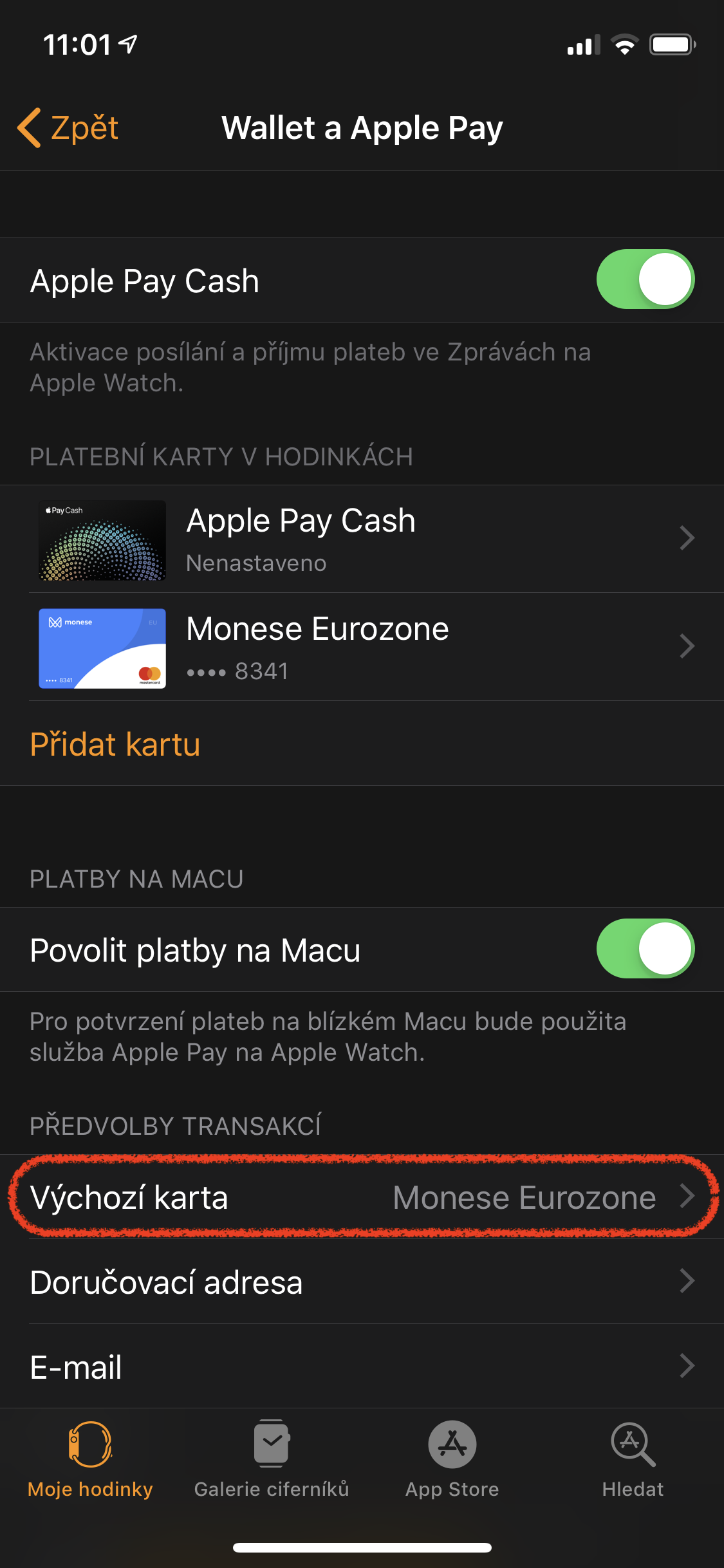 Do Wallet si samozřejmě můžete nahrát více karet a všechny k placení nákupů snadno využívat. Kartu, kterou platíte nejvíce nákupů, je dobré nastavit jako výchozí, což provedete zcela jednoduše v Nastavení – Wallet a Apple Pay, kde na samotném konci “stránky” vyberete u možnosti “Výchozí karta” tu, kterou preferujete. Ta se vám vždy po aktivaci Apple Pay jak na hodinkách, tak na iPhonu vždy zobrazí jako první a tím pádem bude tak vždy jako první připravená platit.