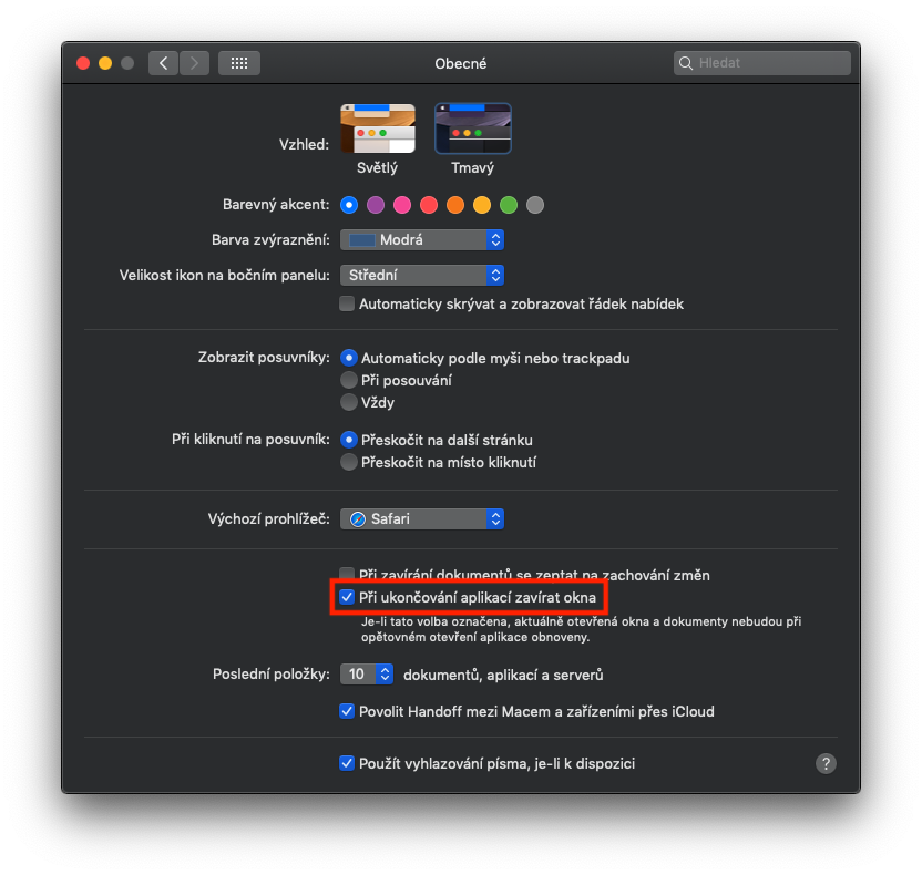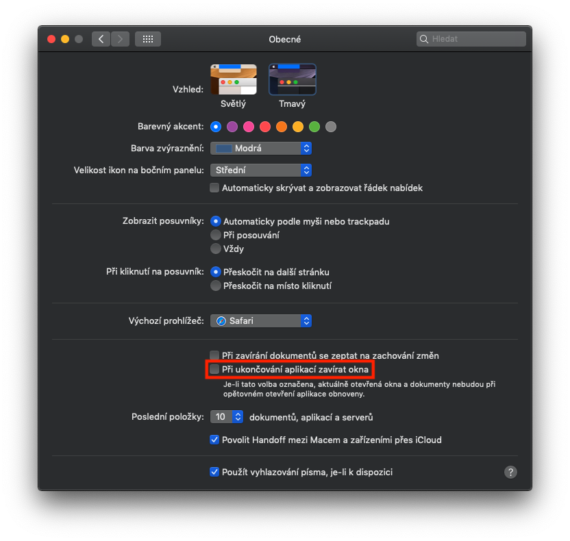 Nejprve je nutné na našem Macu zabrouzdat do předvoleb systému. Rozklikneme tedy v levém horním rohu obrazovky Apple logo a z rozevíracího menu, které se zobrazí, zvolíme možnost Předvolby systému… Otevře se nové okno, kde se přesuneme do kategorie Obecné (první řádek, první ikona). Zde ve spodní části okna odškrtneme možnost Při ukončování aplikaci zavírat okna. První krok je hotov.