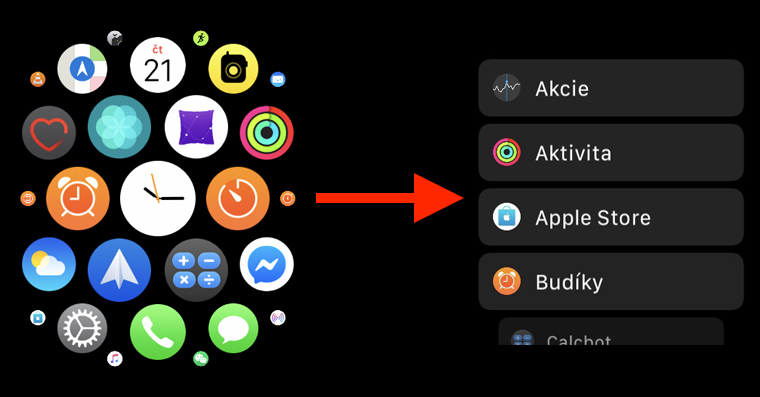 V tomto případě lze nastavení provést pouze na vašich Apple Watch, nikoliv v aplikaci Watch na vašem iPhonu. Proto tedy odemkněte vaše jablečné hodinky a pomocí stisknutí digitální korunky přejděte na zobrazení aplikací. Zde poté silně prstem stiskněte střed obrazovky, dokud se nezobrazí nastavení. V nastavení jsou k dispozici pouze dvě varianty – Mřížka a Seznam. Mřížka je klasické zobrazení „bublin“ vedle sebe, kdežto Seznam představuje abecední seznam aplikací pod sebou. Jaký typ zobrazení si zvolíte, to už záleží jen a jen na vás. Kdykoliv si jej samozřejmě můžete změnit nazpět.