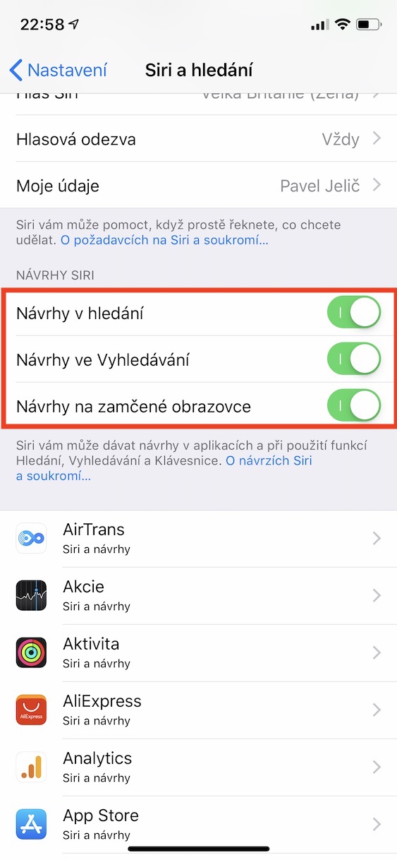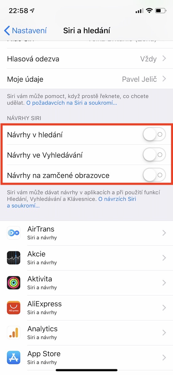 Na vašem iOS zařízení, tzn. na iPhonu či na iPadu, spusťte nativní aplikaci Nastavení. Zde poté sjeďte níže, dokud nenarazíte na kolonku Siri a hledání, kterou rozklikněte. V tomto menu stačí sjet o něco níže, kde už se nachází podnadpis Návrhy Siri a pod ním tři funkce, které můžete deaktivovat. Konkrétně se jedná o Návrhy v hledání, Návrhy ve Vyhledávání a Návrhy na zamčené obrazovce – všechny tyto tři funkce zobrazují návrhy přesně tam, kde to popisují. Záleží tedy jen na vás, kde chcete Návrhy deaktivovat. Jakmile k deaktivaci dojde, tak už se nemusíte o nic víc starat a Návrhy už vás nikde nebudou obtěžovat.