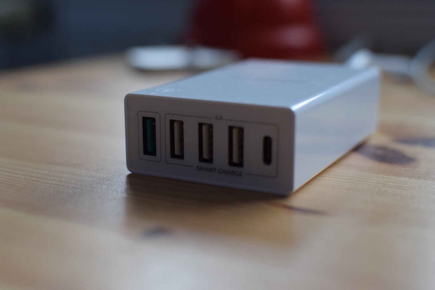 Jak už jste si asi na fotkách v galerii výše spočítali, nabíječka má hned pět portů – čtyři USB-A a jeden USB-C. Jeden USBA port pak podporuje dokonce i Qualcomm Quick Charge 3.0, což však nás jablíčkáře nechává vzhledem k tomu, že iPhony ani iPady tuto technologii nepodporují, chladnými. Pokud však disponujete smartphonem s podporou této technologie, výstup 5 V/3 A, 9 V/2 A a 12 V/1,5 A určitě potěší. My ostatní si budeme muset vystačit “jen” s 3 A v případě USB-C a 2,4 A v případě USB-A. Výkon nabíječky je parádních 63 W. O přívod elektriky do nabíječky se pak stará metr dlouhý kabel s klasickou vidlicí na konci.