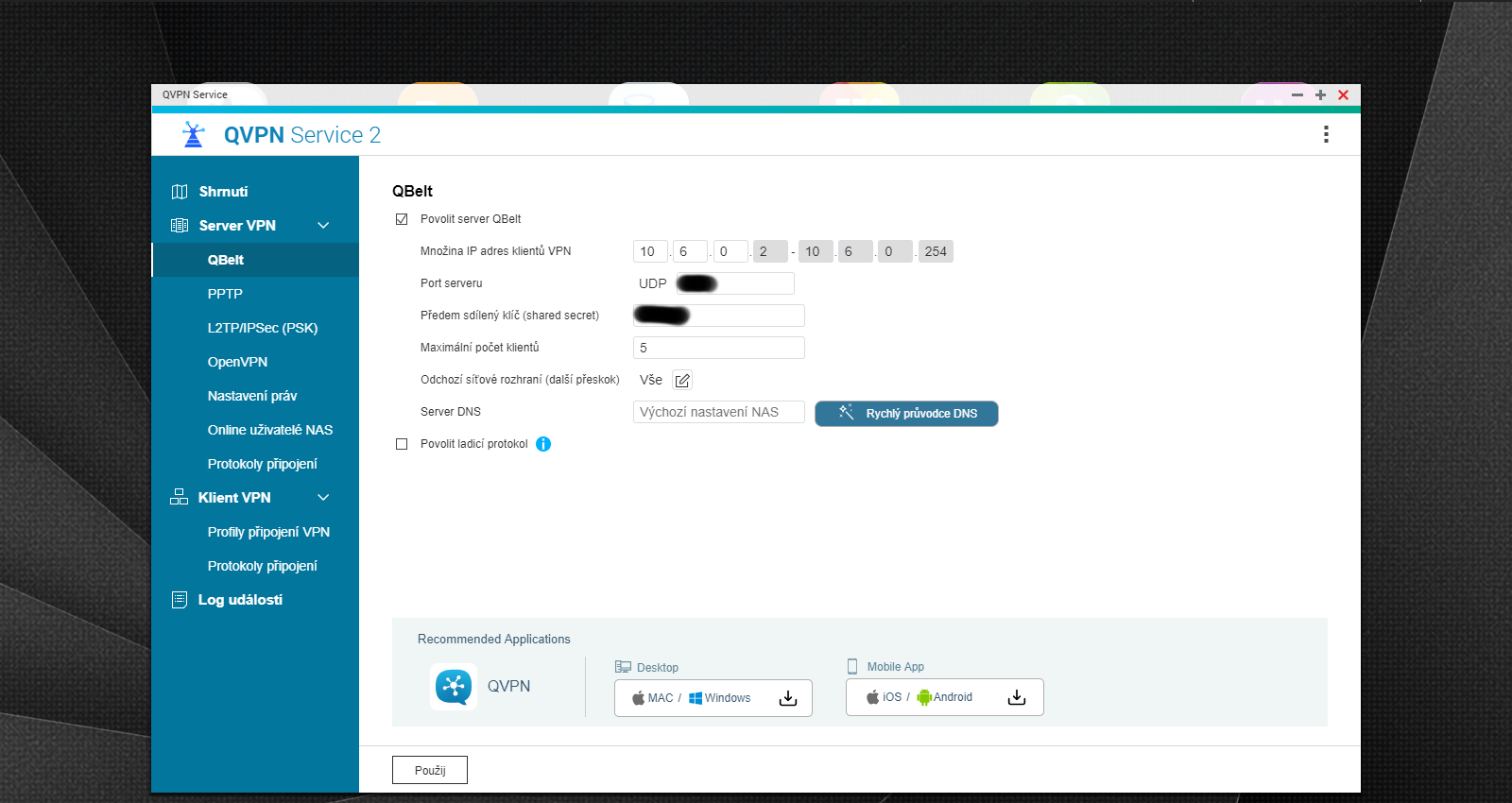 VPN přes protokol Qbelt zajišťuje bezpečné a soukromé připojení k vaší NASce a to odkudkoliv. Ať už se připojujete přes běžná mobilní data, nebo přes nezabezpečenou WiFi síť v kavárně. Aby protokol Qbelt fungoval, je třeba jej nejprve nastavit v rozhraní aplikace QVPN. Toto nastavení najdeme v první záložce v sub-menu Server VPN (viz. další screenshoty). Kromě klasického zapnutí/vypnutí funkce zde najdeme možnosti hlubší konfigurace jednotlivých parametrů sítě, jako je množina IP adres klientů VPN, port serveru, sdílený klíč, nastavení maximálního počtu klientů apod. Pokud nic specifického nastavovat nechcete, stačí funkci povolit, vše nechat na defaultních hodnotách (kromě sdíleného klíče) a službu používat.