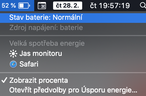 První, jednodušší způsob, vám zobrazí pouze informaci o tom, v jakém stavu baterie je. Pro obyčejného uživatele je tato informace samozřejmě dostačující. Abyste zobrazili informaci o baterii, tak stačí podržet klávesu Option (Alt) a v horní liště kliknout levým tlačítkem na ikonu baterie. Zobrazí se rozevírací menu, ve kterém vás zajímá hned první řádek – Stav baterie. Stav baterie se může zobrazit ve čtyřech formách: