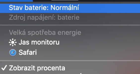 První, jednodušší způsob, vám zobrazí pouze informaci o tom, v jakém stavu baterie je. Pro obyčejného uživatele je tato informace samozřejmě dostačující. Abyste zobrazili informaci o baterii, tak stačí podržet klávesu Option (Alt) a v horní liště kliknout levým tlačítkem na ikonu baterie. Zobrazí se rozevírací menu, ve kterém vás zajímá hned první řádek – Stav baterie. Stav baterie se může zobrazit ve čtyřech formách: