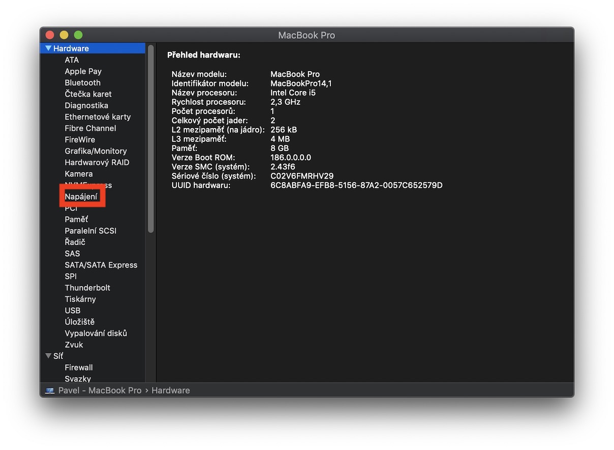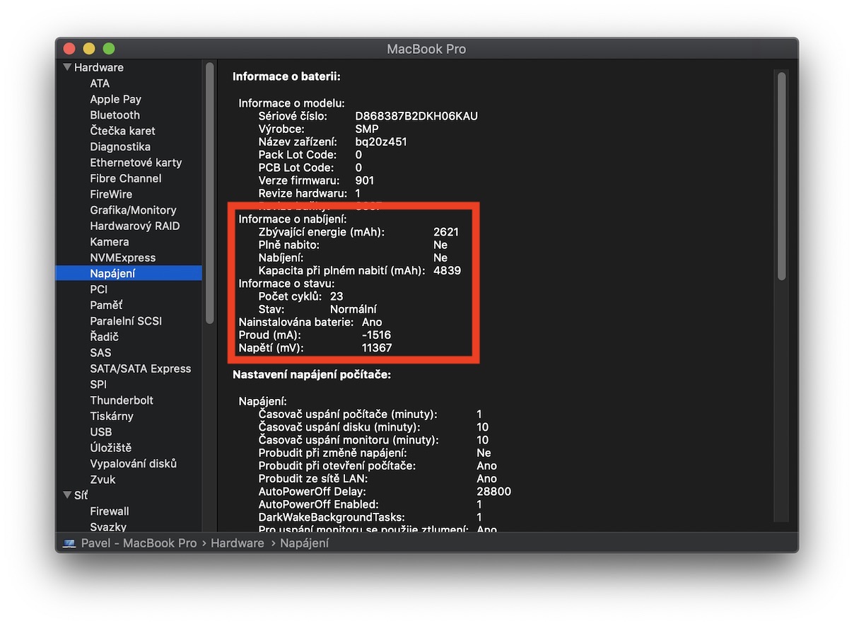 Druhý způsob je určen pro uživatele, kteří se v technologiích vyznají, a pouhé dvě slova, která definují stav jejich baterie, jim jednoduše nestačí. Abyste zjistili podrobné informace o vaší baterii, tak v horní liště klikněte na Apple logo a z rozevíracího menu vyberte možnost O tomto Macu. Poté se ujistěte, že se nacházíte v záložce Přehled a ve spodní části klikněte na tlačítko Systémový profil. Objeví se další okno plné textu, v jehož levém menu klikněte na záložku Napájení. Zde už poté můžete pod textem Informace o nabíjeníInformace o stavu zobrazit, jak si baterie vede. Zobrazit si můžete například počet cyklů baterie, stav baterie, zbývající energie či maximální kapacitu baterie.