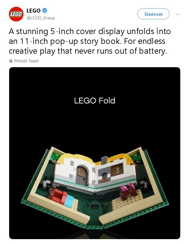 Ohebné telefony jsou v posledních dnech hlavním tématem všech technologických webů, ale nejen jich. Svým dílem chce přispět například i Lego, které představilo vlastní LEGO Fold. Na Twitteru se tato společnost pochlubila, že jejich skládací „zařízení“ má 5palcový displej, který má po rozložení úhlopříčku dokonce 11 palců. Navíc slibují nekonečnou výdrž na baterii. Marketingové oddělení Lega si zaslouží velký palec nahoru za parádní nápad.