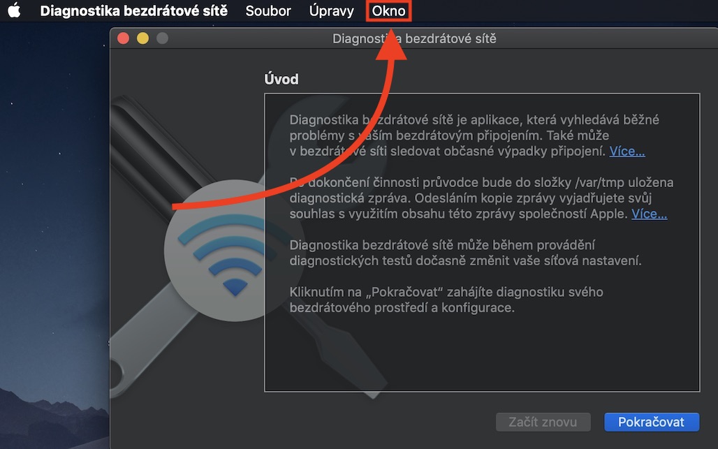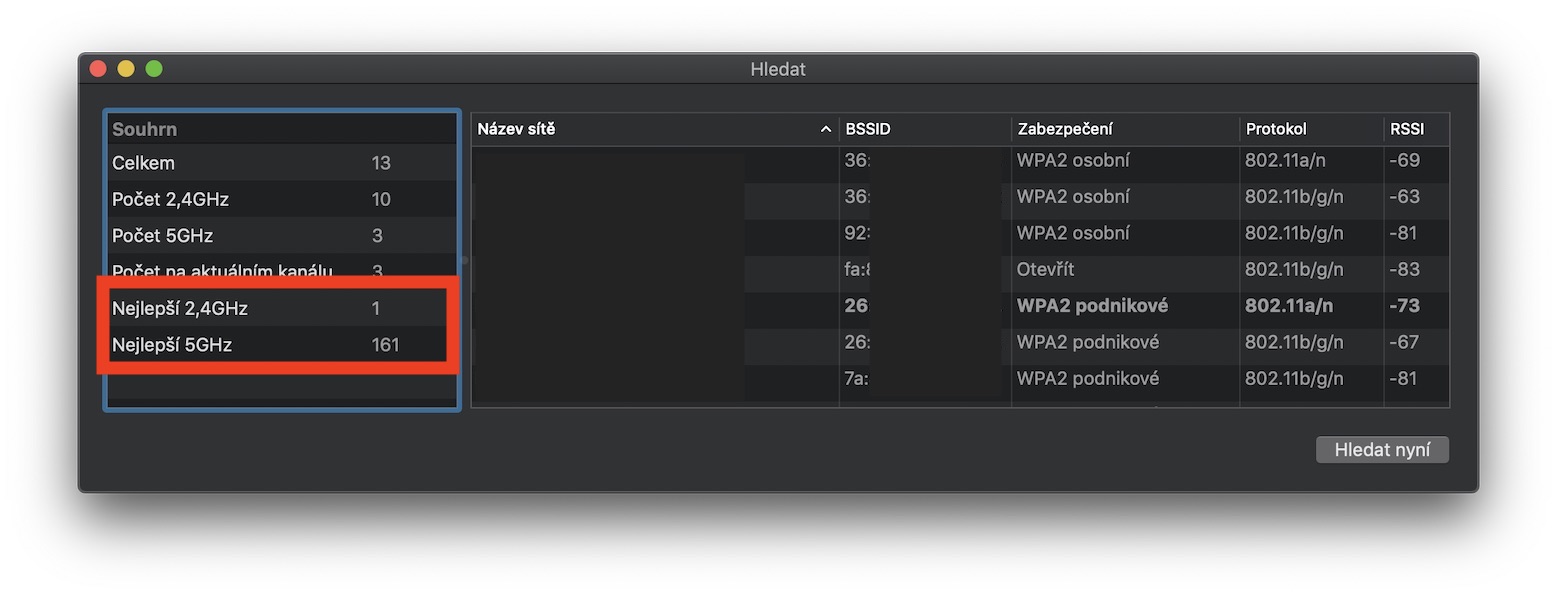 Na vašem Macu podržte klávesu Option (Alt) a v horní liště klikněte na ikonku Wi-Fi. Zobrazí se rozsáhlé informace o vašem připojení. Vás však zajímá kolonka Otevřít aplikaci Diagnostika bezdrátové sítě…, na kterou klikněte. Zobrazí se nové okno, které nepotřebujeme, a tak jej ignorujte. V horní liště nyní klikneme na záložku Okno a z rozevíracího menu, které se zobrazí, vybereme možnost Hledat. Otevře se další okno, ve kterém už se po inicializaci a prohledávání okolních sítí zobrazí v levé části Souhrn. Uvnitř souhrnu už vás zajímá kolonka Nejlepší 2,4GHz a Nejlepší 5GHz. Vedle obou kolonek se nachází číslo či čísla, které představují nejlepší kanály. Jednoduše si je stačí kamkoliv zapsat a v nastavení routeru už je jen změnit.