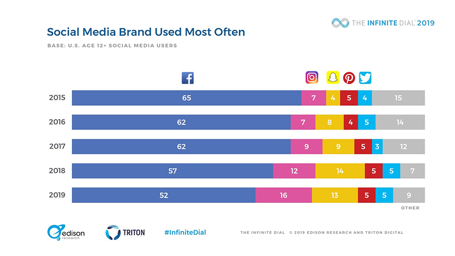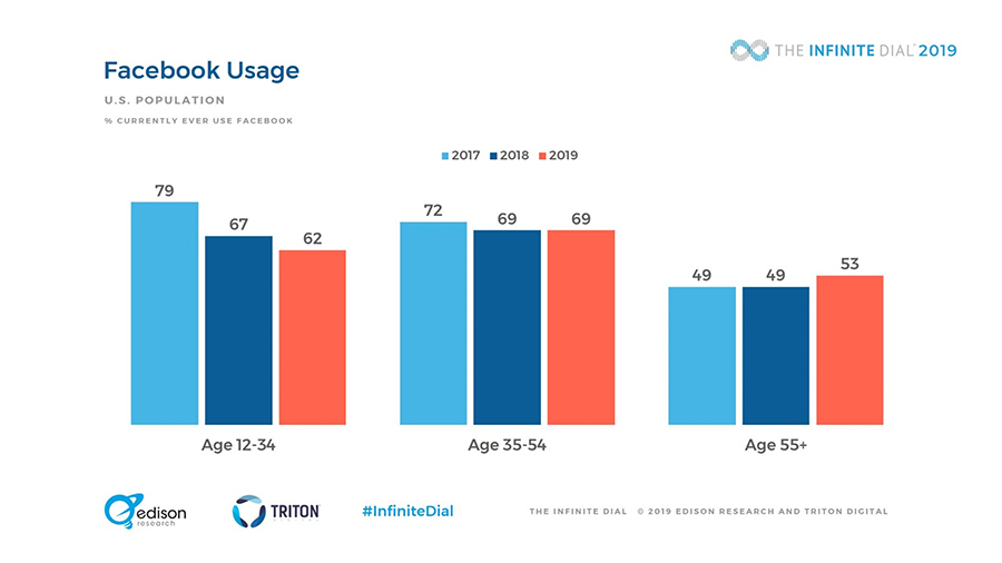 Naopak lidé starší pětapadesáti let zaznamenali dle grafů společnosti Edison Research, která se v průzkumu The Infinite Dial 2019 zabývala popularitou sociálních sítí ve Spojených státech amerických, oproti předchozím rokům značný, poměrně nezvyklý nárůst. Z těchto grafů můžeme nadále vyčíst, že Facebook oproti roku 2017 ztratil okolo patnácti milionů tamních uživatelů, což je asi o 41 % lidí více, než kolik má naše republika. Tito „odpadlíci“ si zrušili svůj účet a během doby dvou let se na něj již nepřipojili.