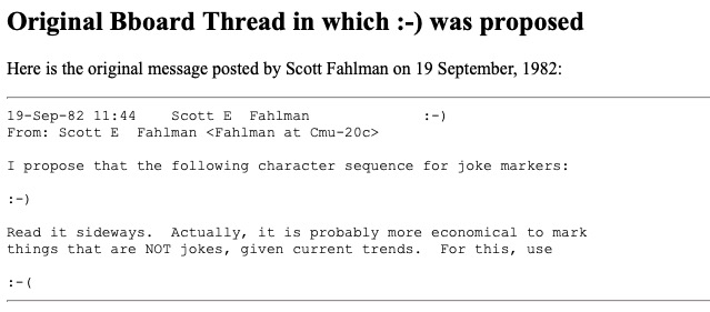 První emotikon  byl použit 19. září roku 1982. Tehdy Scott Fahlam, počítačový vědec, vytvořil na internetu první zdokumentovaný zápis smajlíku, vytvořeného z interpunkčních znaků. „Následující posloupnost znaků navrhuji pro použití všem tvůrcům vtipů :-),“ napsal.