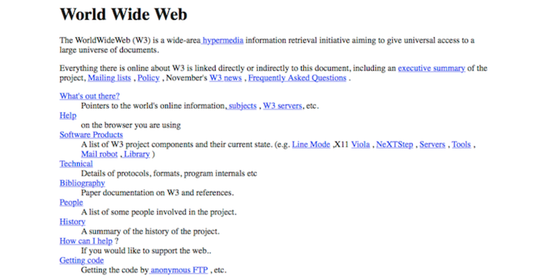 První webovou stránkou na webu byla – překvapivě – stránka o celosvětové síti. Dlouho předtím, než se internet stal běžnou součástí každodenních životů většiny lidí, se jednalo o takzvanou „iniciativu pro hypermediální vyhledávání informací, jejímž cílem je umožnit univerzální přístup k široké nabídce dokumentů“. Stránku, obsahující jen text a jednoduché odkazy, si můžete prohlédnout zde.