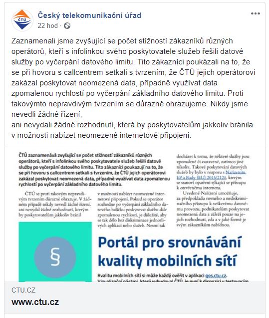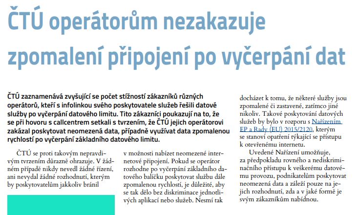 Nic z toho však podle úřadu není pravda. Konkrétně je ve zprávě uvedeno toto stanovisko: „ČTÚ se proti takovým nepravdivým tvrzením důrazně ohrazuje. V žádném případě nikdy nevedl žádné řízení, ani nevydal žádné rozhodnutí, kterým by poskytovatelům jakkoliv bránil v možnosti nabízet neomezené internetové připojení. Pokud se operátor rozhodne po vyčerpání základního datového balíčku poskytovat službu dále zpomalenou rychlostí, je důležité, aby se tak dělo bez diskriminace jednotlivých aplikací nebo služeb. Nesmí tak docházet k tomu, že některé služby jsou zpomalené či zastavené, zatímco jiné nikoliv. Takové poskytování datových služeb by bylo v rozporu s Nařízením EP a Rady (EU) 2015/2120, kterým se stanoví opatření týkající se přístupu k otevřenému internetu.“