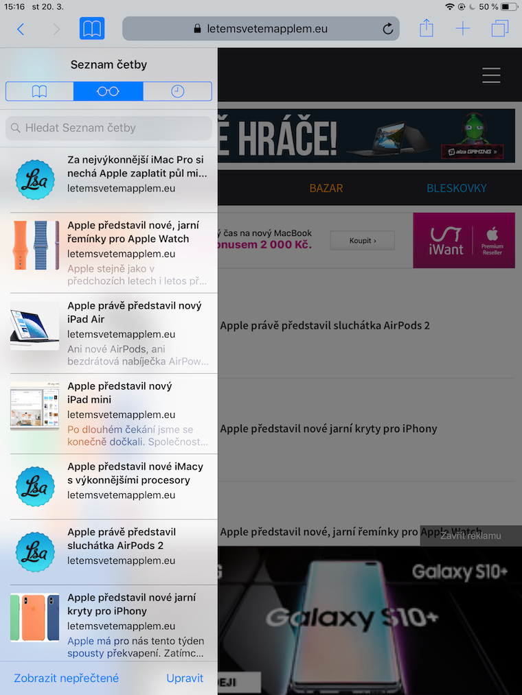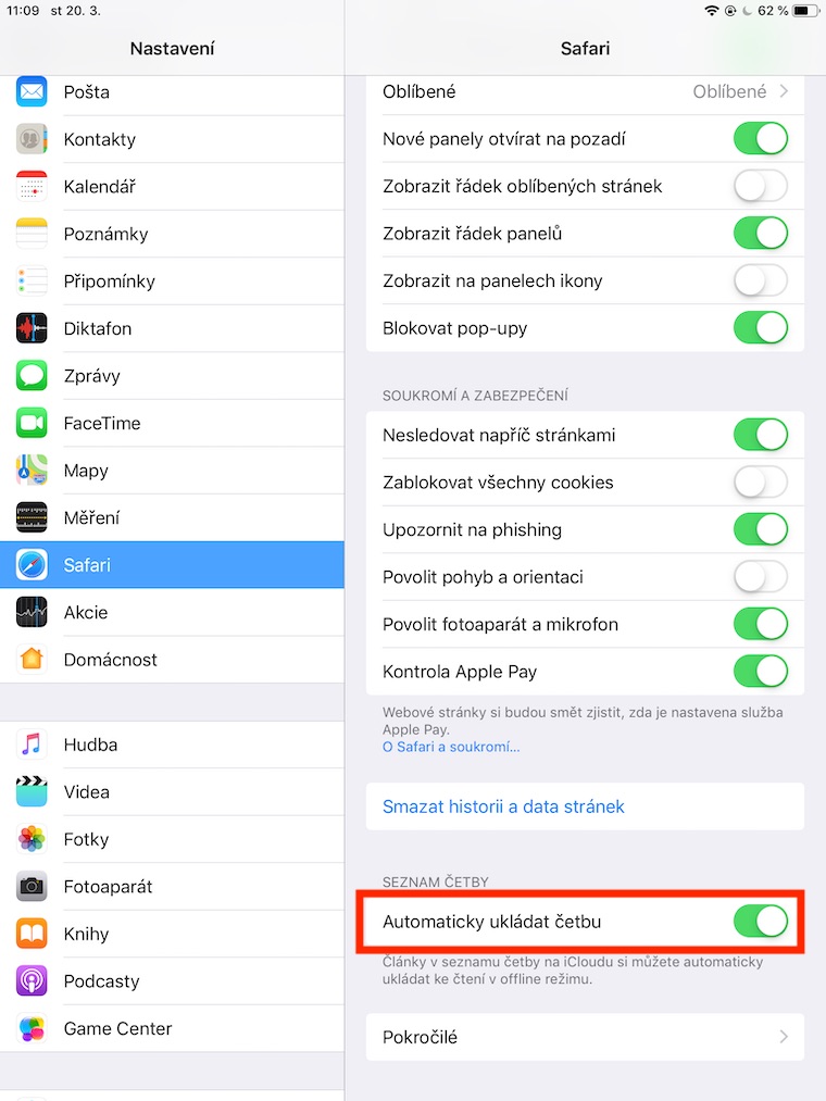 Obsah webu můžete do seznamu četby ukládat také pro zhlédnutí offline. Ukládání offline nastavíte v Nastavení -> Safari, kde zaškrtnete možnost automatického ukládání četby.