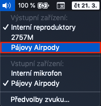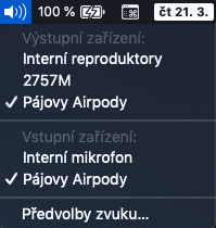 Pokud se vaše sluchátka připojí na iPhone, ale chcete je přepojit na Mac, tak je postup opravdu jednoduchý. Podržte na vašem Macu či MacBooku klávesu Option a v pravé části horní lišty klikněte na ikonku ovládání hlasitosti. Otevře se rozbalovací menu, ve kterém už pouze stačí najet na vaše AirPods a kliknout na ně. Takto jednoduše se AirPody během chvilky přepojí.
