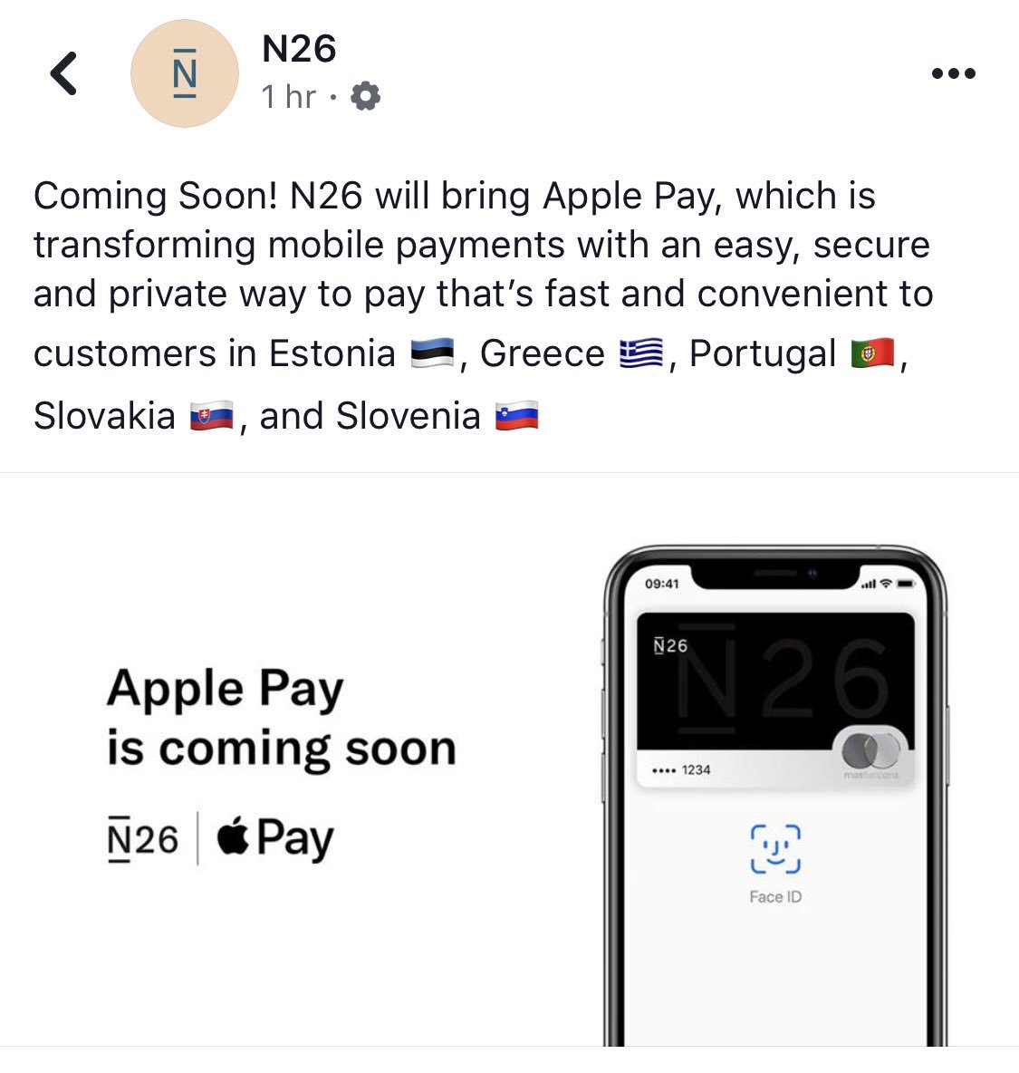 O brzkém vstupu služby na trhy výše uvedených zemí informovala na svém Twitteru před malou chvílí mobilní banka N26, která do svého tweetu zahrnula i Slovensko a Rakousko. Jablíčkáři v těchto zemí tak mají příchod Apple Pay potvrzen dalším velmi zajímavým zdrojem.