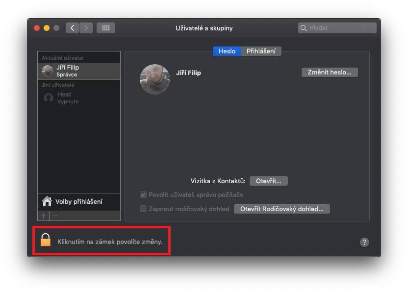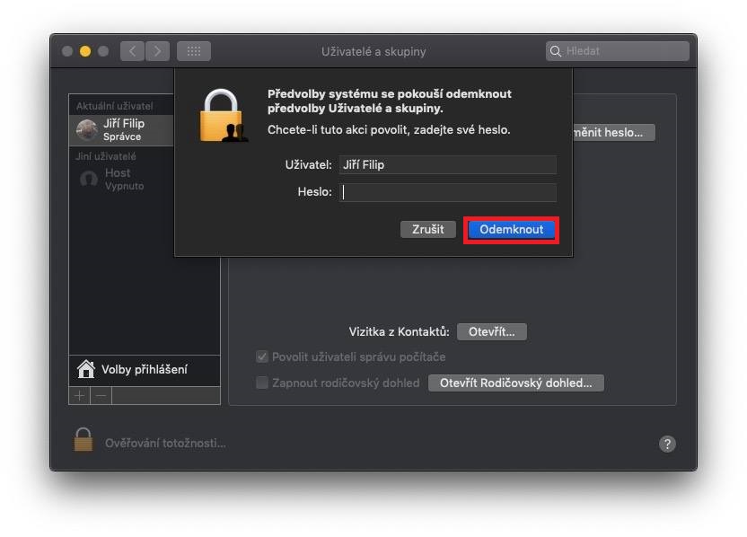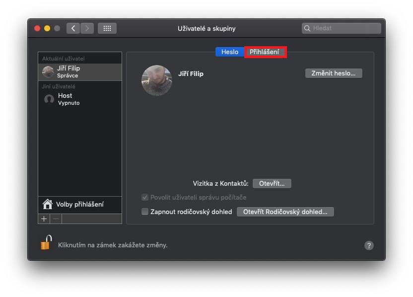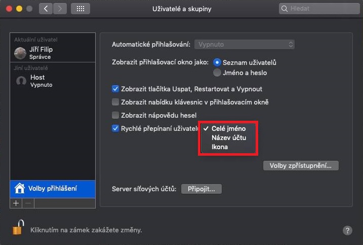 Pro aktivaci rychlého přepínání uživatelů klikněte v levé části obrazovky na logo Apple. V rozevírací nabídce, která se zobrazí, vyberte možnost Předvolby systému… Otevře se nové okno s předvolbami, kde vás zajímá sekce Uživatelé a skupiny (čtvrtý řádek, první ikona), kterou rozklikněte. Poté klikněte v levé části okna na zámeček a pomocí hesla se autorizujte k možnosti provádět úpravy. Nyní v horním menu klikněte na možnost Přihlášení. Poté v levé části okna klikněte pod uživatelskými profily na tlačítko Volby přihlášení. Zde už pouze stačí zaškrtnout možnost Rychlé přepínání uživatelů. K dispozici jsou navíc tři možnosti zobrazení – Celé jméno, Název účtu a Ikona. Zobrazení se projeví v pravé části horní lišty, kde se po aktivaci rychlého přepínání zobrazí právě vámi zvolená možnost. Pokud si zvolíte například možnost Celé jméno, tak se v horní liště objeví jméno vašeho profilu. Pokud na jméno kliknete, zobrazí se ostatní účty, ke kterým se můžete jediným kliknutím přihlásit.