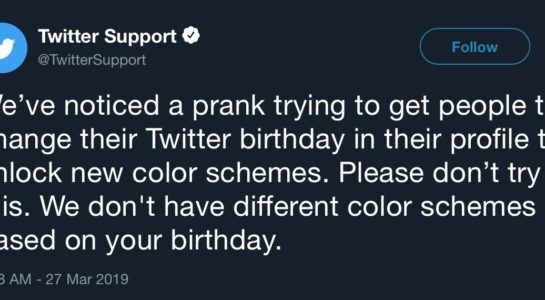Po internetu se šíří informace, podle které Twitter obsahuje skrytou funkci. Pomocí ní jste se měli dostat k novým barevným schématům aplikace, ale rozhodně to nezkoušejte. Vše spočívá v tom, že se vám nové barvy mají zpřístupnit, když si změníte datum narození na rok 2007. Místo barev však od Twitteru dostanete dárek v podobě uzamčení účtu, protože váš nastavený věk bude nižší než minimálních 13 let.