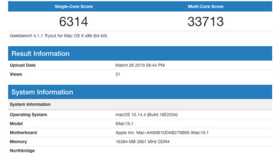 Benchmarky byly podle záznamů v databázi provedeny na stroji s označením “iMac19.1”, který byl osazen osmijádrovým procesorem Intel Core i9-9900K s taktem 3,6 GHz a 16 GB RAM pamětí. Jedná se tedy o vyšší výbavu,  která vás vyjde minimálně na 89 190 korun. V počítači byl navíc již nainstalován nejnovější operační systém, tedy macOS Mojave 10.14.4. Výsledky testu jsou více než dobré. iMac se totiž dostal na skóre 6314 bodů v testu na jedno jádro a na 33713 bodů v testu na více jader. Oproti tomu “nejnabušenější” iMac z roku 2017 – tedy stroj s Intel Core i7-7700K dosáhl skóre “jen” 5684 bodů na jedno jádro a 19371 bodů na více jader. Za novinkou tak především ve vícejaderném testu skutečně zaostává.