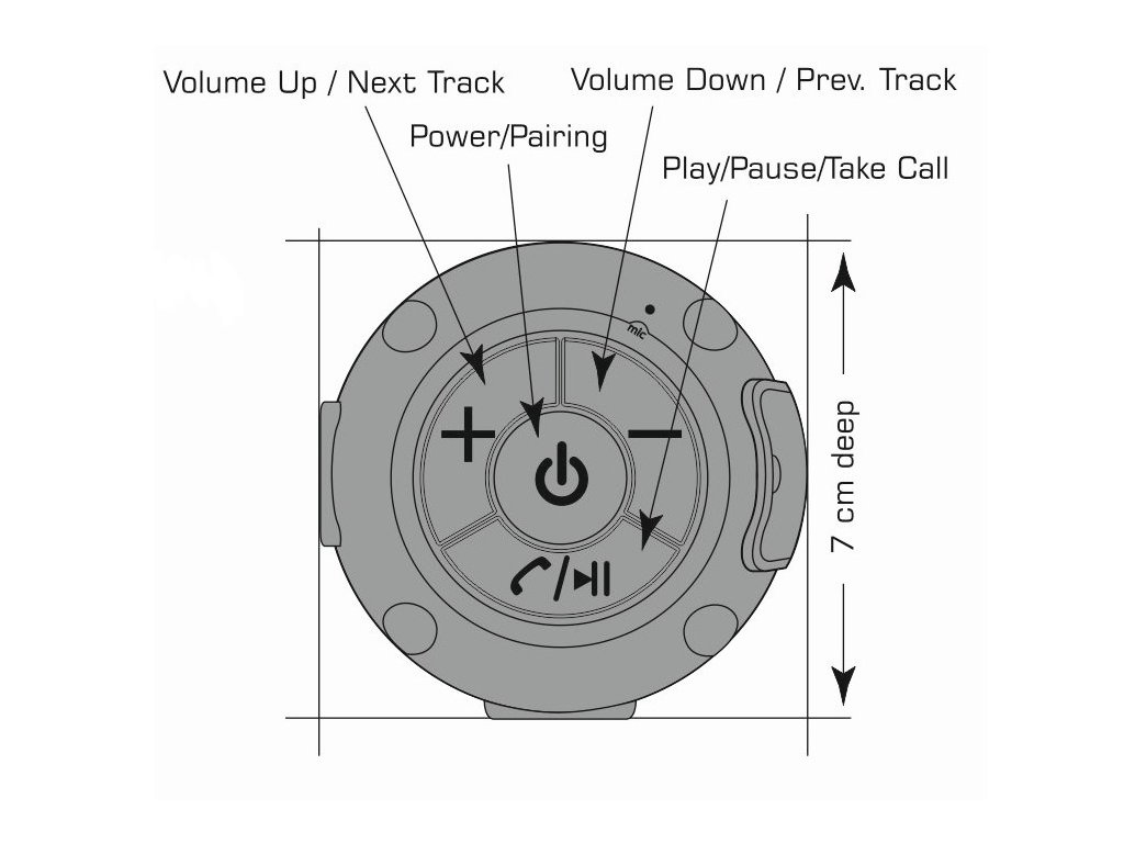 Velice zajímavá je poté horní část reproduktoru. Zde se nachází dohromady čtyři tlačítka. Uprostřed je klasické zapínací/vypínací tlačítko, které mimo jiné slouží ke spárování s vaším zařízením. Okolo tohoto tlačítka se nachází další tři, kdy jedno z nich slouží k pozastavení hudby a zároveň k přijatí příchozího hovoru. Nesmí samozřejmě chybět dvě tlačítka, pomocí kterých můžete jednoduše regulovat hlasitost či přepínat skladby.