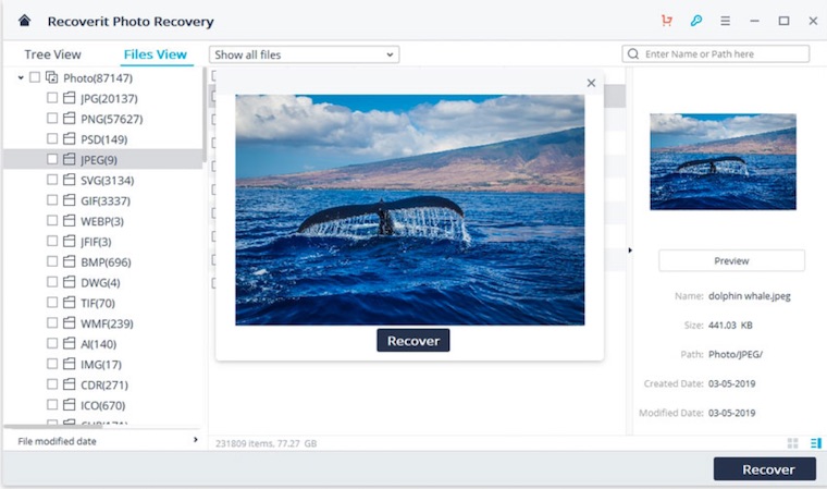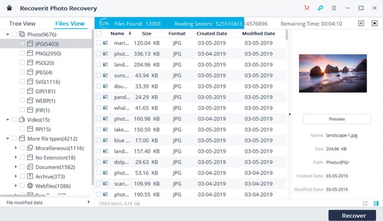 - Jakmile je proces skenování dokončen, můžete obnovitelné soubory zkontrolovat v seznamu výsledků. Aplikace rovněž umožňuje zobrazení náhledu obnovených dat. Po provedení kontroly jednoduše klikněte na tlačítko „Recover“, abyste zahájili proces obnovení MP4 souborů.