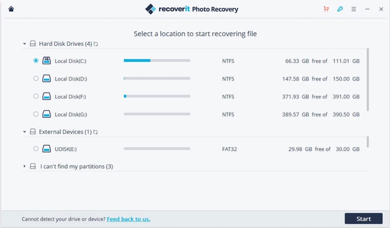 - Vyberte pevný disk nebo úložné zařízení, ze kterého chcete své soubory obnovit. Poté klikněte na tlačítko „Start“ pro zahájení procesu obnovy.