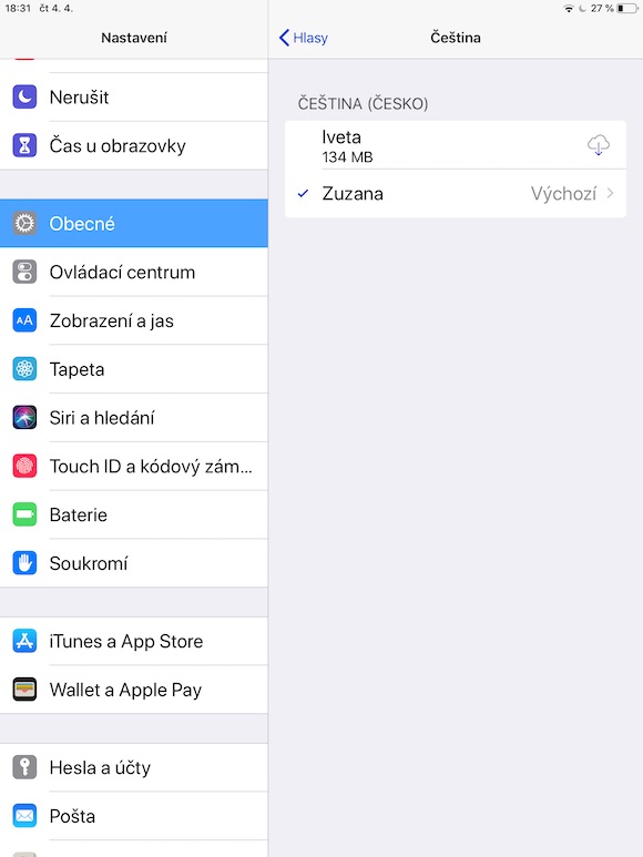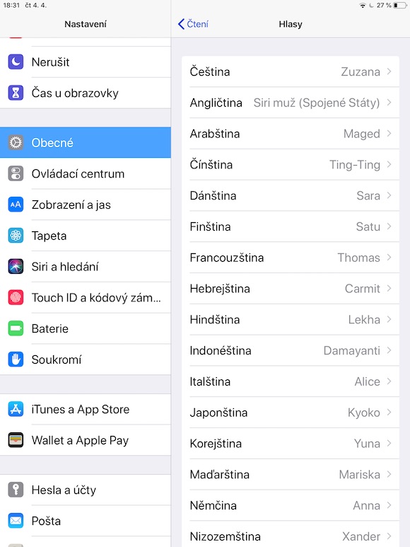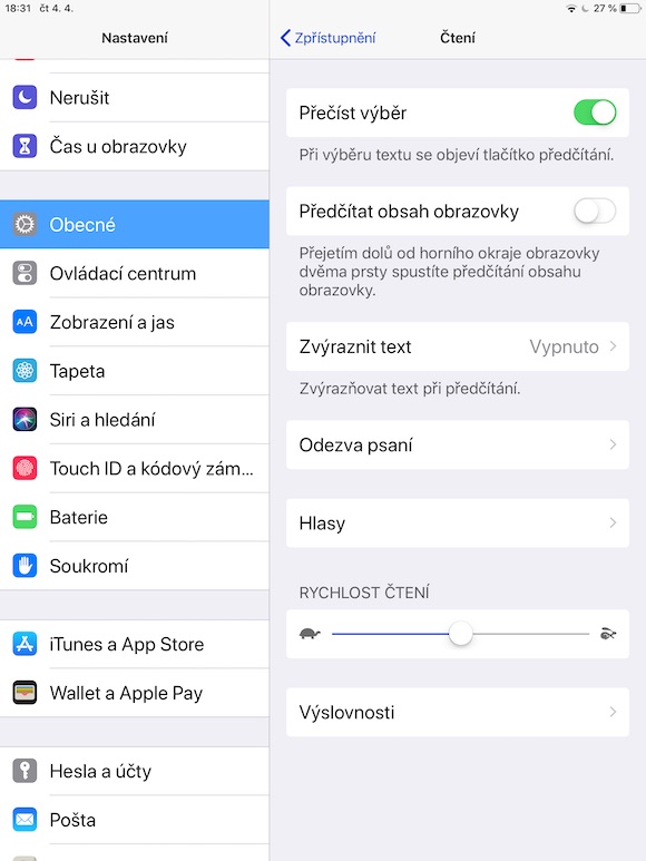 iPad také disponuje schopností přečíst nahlas jakýkoliv vybraný text nebo celou stránku. Hlasitost, řeč i hlas jako takový si můžete nastavit v Nastavení -> Obecné -> Zpřístupnění -> Čtení.