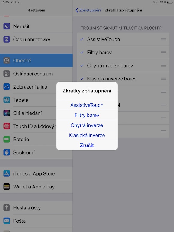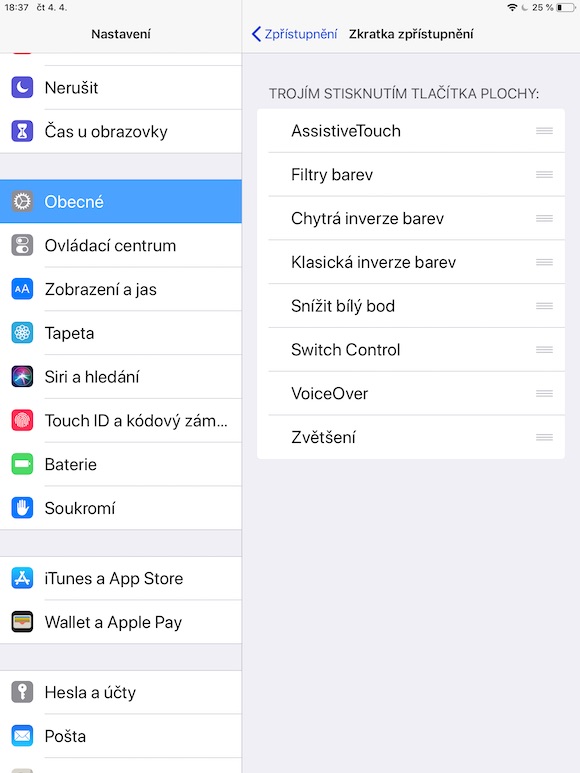 Operační systém iOS nabízí více než 150 různých možností přizpůsobení, které mají za úkol pomoci uživatelům s přístupností. Užitečnou funkcí je zkratka přístupnosti, která spočívá v tom, že vám váš iPad po trojím stisku Home Buttonu nabídne menu Zpřístupnění. Tuto funkci můžete aktivovat v Nastavení -> Obecné -> Zpřístupnění, kde zascrollujete až dolů, kde klepnete na položku Zkratka zpřístupnění. Zde můžete nastavit funkce, které se vám v rámci zkratky budou zobrazovat, a jejich pořadí.