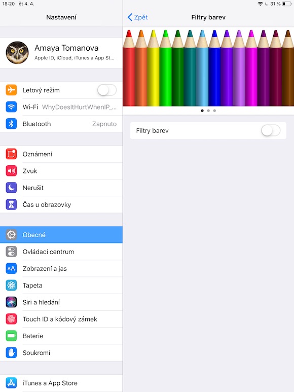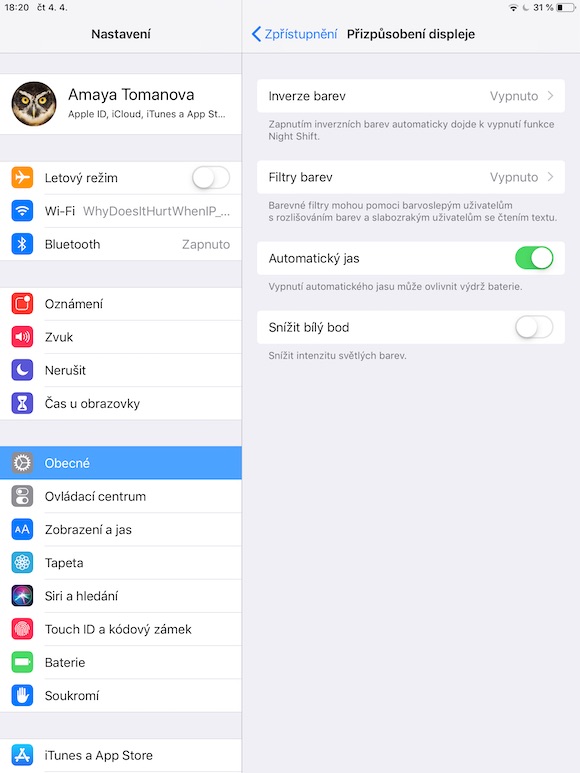 Jednou z nepříjemností, která často seniorský věk doprovází, je zhoršování zraku. iPady od Applu umí tón a jas svých displejů nejenom přizpůsobit okolnímu světlu, ale jejich vlastnosti lze upravit tak, aby tablet mohli pohodlně používat lidé s různými zrakovými odlišnostmi – ať už souvisejí s vnímáním barev nebo slabostí zraku. Této skupině uživatelů vychází Apple vstříc soustavou funkcí s názvem Přizpůsobení displeje. K těm získáte přístup v Nastavení -> Obecné -> Zpřístupnění, kde vyhledáte kategorii „Zrak“.