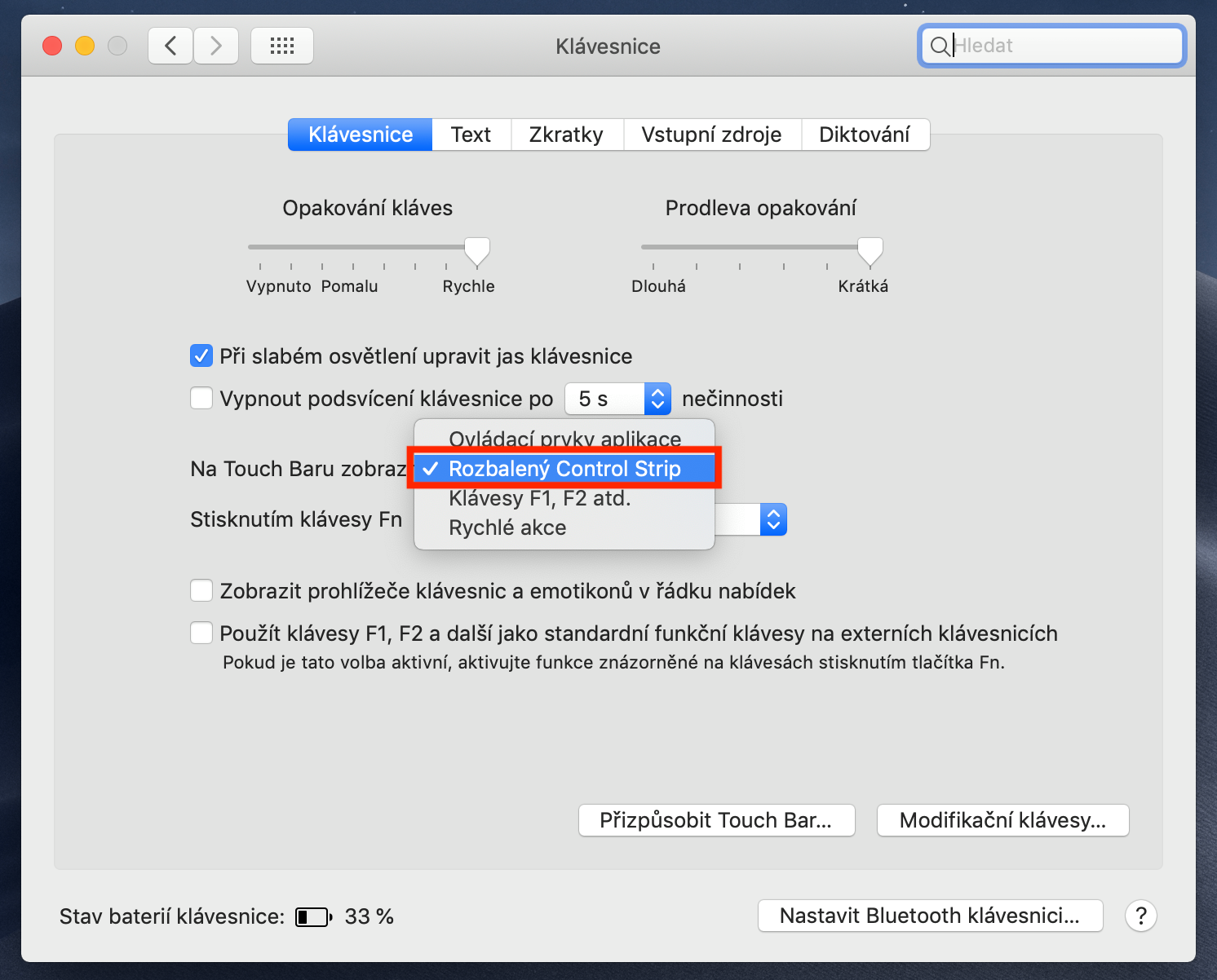 Postup je v tomto případě vcelku jednoduchý. Samozřejmě musíte vlastnit MacBook Pro s Touch Barem, jinak vám tento návod nebude fungovat. Na vašem MacBooku Pro tedy klikněte v levém horním rohu obrazovky na ikonu Apple loga. Poté z rozevíracího menu vyberte nic jiného, než známé Předvolby systému… Po kliknutí na tuto možnost se vám otevře nové okno společně se všemi dostupnými předvolbami. Vás v tomto případě zajímá pouze sekce Klávesnice, která se nachází ve druhém řádku na třetí pozici. Sekci Klávesnice rozklikněte, a poté se přesvědčte, že se v horním menu nacházíte v záložce Klávesnice. Zde už se stačí zaměřit na možnost Na Touch Baru zobrazit a rozbalovací menu vedle. Na rozbalovací menu klikněte a z nabídky vyberte možnost Rozbalený Control Strip. Poté můžete předvolby zavřít.