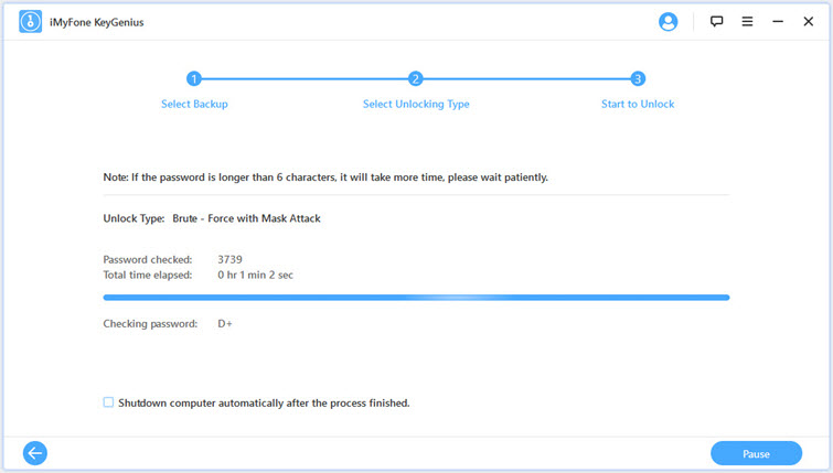 Celý proces probíhá ve třech jednoduchých krocích. Nejprve je třeba, abyste si program stáhli a nainstalovali. Poté jej spusťte a vyberte pomocí průzkumníka souborů zašifrovanou zálohu. Nyní už si vyberte ze třech dostupných metod dešifrování, které jsme si popsali v odstavci výše. Poté programu sdělíte všechny informace, které mu mohou v dešifrování pomoci, tzn. délka, použití znaků, apod. Poté už vám nezbývá nic jiného, než jen čekat, dokud se heslo dešifruje.