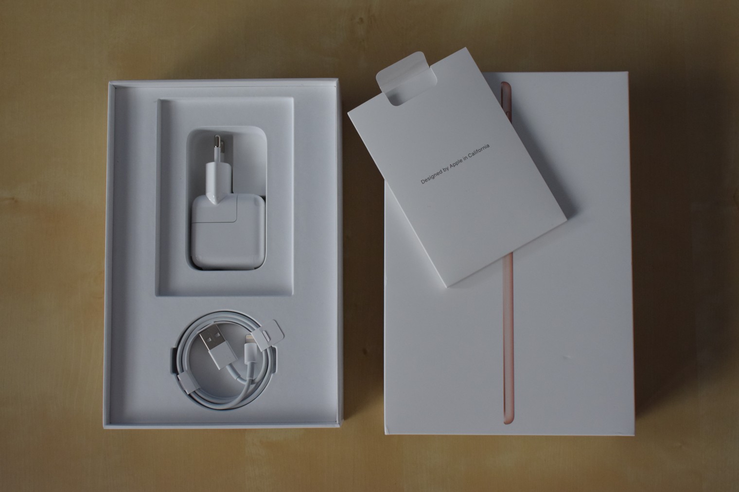 Přestože balení iPadu ničím neohromí, pár řádků bychom mu věnovat ze zvyku měli. Nový jablečný tablet vám dorazí v klasické bílé krabici s brandingem po bocích, jeho vyobrazením na horní straně a detaily o jeho hardwaru na spodku. Po vysunutí horní části krabice a vytažení iPadu se vám do rukou dostane složka s manuály a nálepkami, pod kterou následně naleznete i metrový Lightning/USB-A kabel a 10W  adaptér. Právě ten je však svým způsobem zajímavý. V nabídce Applu na jeho oficiálních stránkách byste jej totiž hledali k samostatné koupi marně. Na Online Storu totiž naleznete buď 5W či až 12W, mezi tím však již nic. Nejedná se ale samozřejmě o nic, z čeho by člověka spadla brada až na zem.