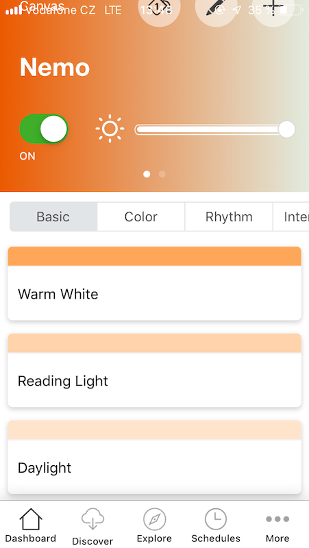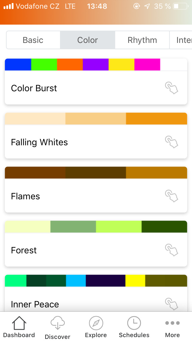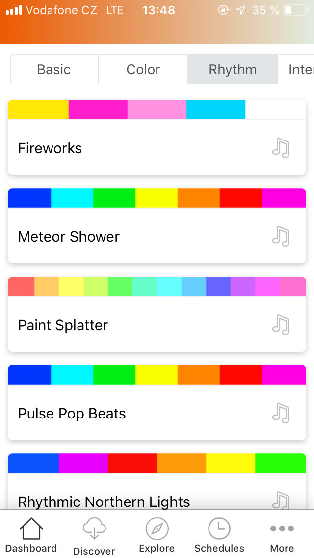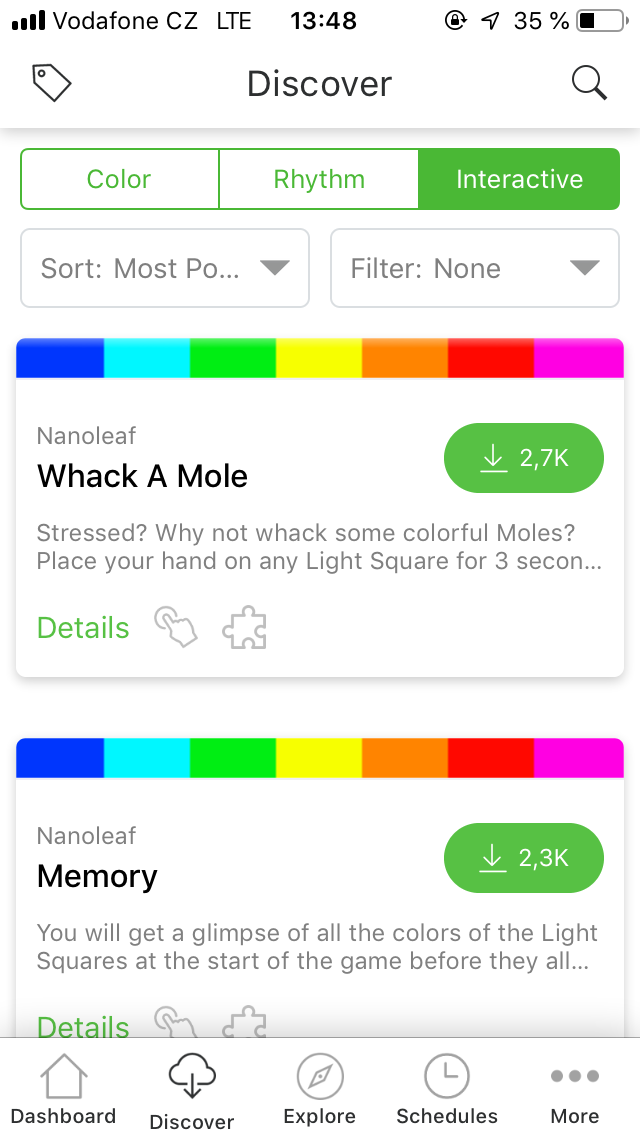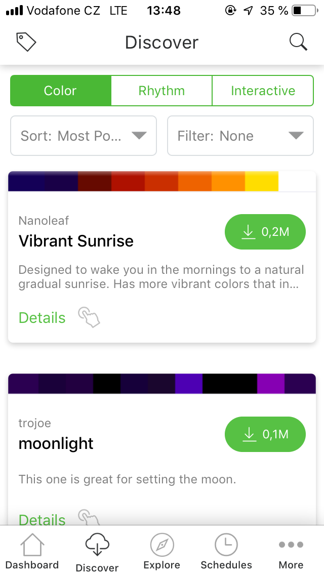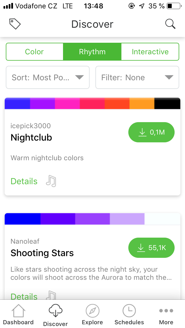 V aplikaci Nanoleaf si pod aktuálně vybraným motivem můžeme povšimnout různých kategorií. Pro nás bude určitě nejzajímavější karta Color a Rhythm. V kategorii Color si můžeme vybrat z již přednastavených barevných schémat to, které se nám v dané situaci nejvíce líbí, a při poslechu hudby zase můžeme sáhnout po čemkoliv z druhé kategorie – Rhythm. Ve spodní části obrazovky se taktéž nachází karta Discover. V té si můžeme vybrat z velice širokého spektra těch nejrůznějších barevných schémat, které posléze můžeme stáhnout a aplikovat na naše chytré osvětlení.