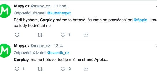 Mapy.cz jsou v České republice díky své přesnosti a spoustě různých možností, které uživatelům nabízí, velmi oblíbené. Už dávno neplatí, že se Mapy využívají pouze na plánování víkendových rodinných výletů. Stále více uživatelů je začíná upřednostňovat například i před Google Maps, Waze či Apple Maps. Zatímco však Google Maps či Waze už v CarPlay chvíli jsou, Mapy od Seznamu lze v tuto chvíli využívat “jen” přes mobilní aplikaci, popřípadě webové rozhraní. Na Twitteru však nyní Mapy.cz potvrdily, že již mají svoji aplikaci připravenou i pro CarPlay, které se s příchodem iOS 12 otevřelo aplikacím 3. stran. Nyní už stačí “jen” to, aby Apple aplikaci schválil a uživatelé ji budou moci začít na displejích svých automobilů vesele využívat. Právě schválení je však bohužel mnohdy kamenem úrazu, jelikož Applu může trvat skutečně dlouho. To ostatně potvrzuje i samotný Seznam, respektive mapy.cz, v tweetu, který si můžete prohlédnout níže.