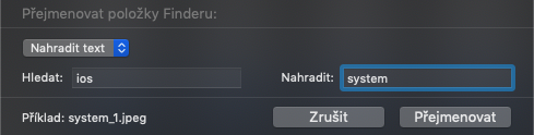 Příklad: pokud mají obrázky například formát ios_XX, do pole Hledat napíšeme ios a do druhého políčka Nahradit napíšeme system, tak se všechny soubory přejmenují na system_XX.