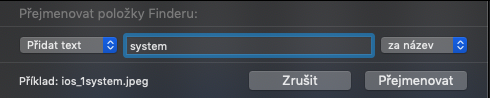 Příklad: pokud jsou položky ve formátu ios_XX, do textového pole napíšeme system a z rozbalovacího menu vybereme možnost za název, tak budou mít všechny soubory po přejmenování název ios_XXsystem. Pokud samozřejmě zvolíme druhou možnost před název, tak se položky budou jmenovat systemios_XX.