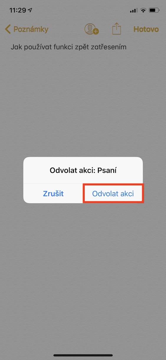 Dejme tomu, že si píšete nějaký text v poznámkách. Najednou jej chcete zkopírovat, avšak namísto kopírování jen omylem smažete. V tomto případě se bude funkce Zpět zatřesením opravdu hodit. Po smazání tedy nedělejte nic jiného a neprodleně zatřeste vaším zařízením. Zobrazí se notifikace s názvem Odvolat akci: Psaní, kde stačí kliknout na tlačítko Odvolat akci. Poté se smazaný text vrátí na své místo.