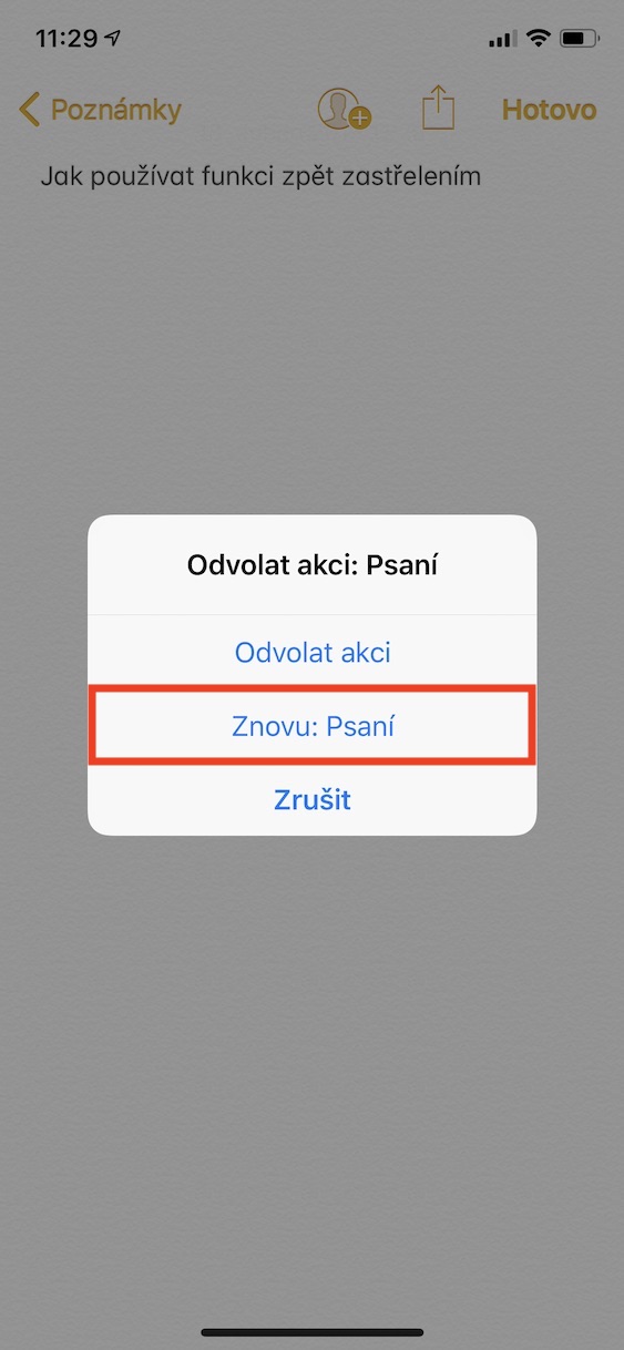 Pokud jste měli nějaký text téměř hotový, avšak omylem jste použili funkci Zpět zatřesením a odvolali jste akci, tak se můžete vrátit i vpřed. Po stisknutí možnosti Odvolat akci stačí opět zařízením zatřást a nyní zvolit možnost Znovu: Psaní. Takto vrátíte odvolaný text zpět.