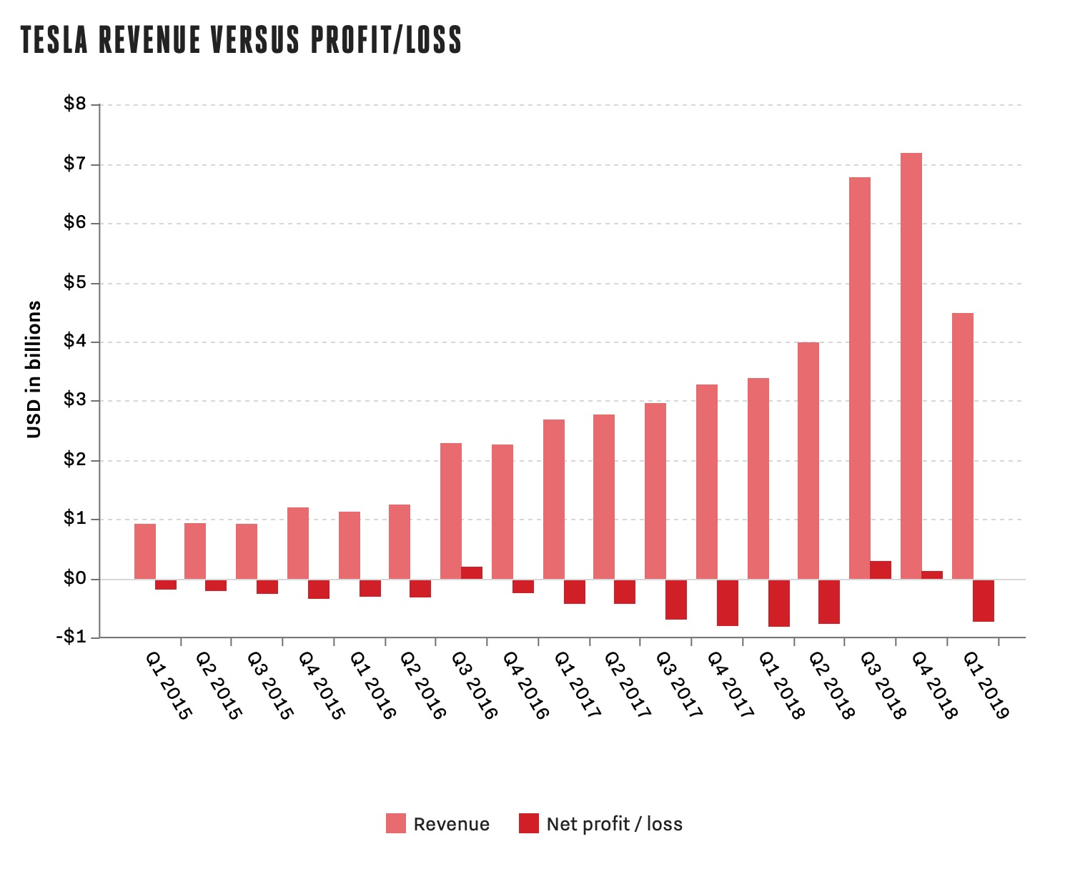Společnost dokonce za první čtvrtletí tohoto roku zaznamenala ztrátu ve výši 702 milionů dolarů i přesto, že příjmy dosáhly hodnoty 4.5 miliardy dolarů. Pro porovnání můžeme uvést, že ve stejném období minulého roku činily příjmy Tesly jen 2.6 miliardy dolarů a poslední kvartál roku 2018 však znamenal pro společnost příjmy 7.2 miliard dolarů.
