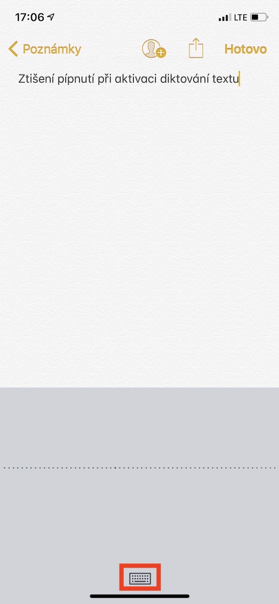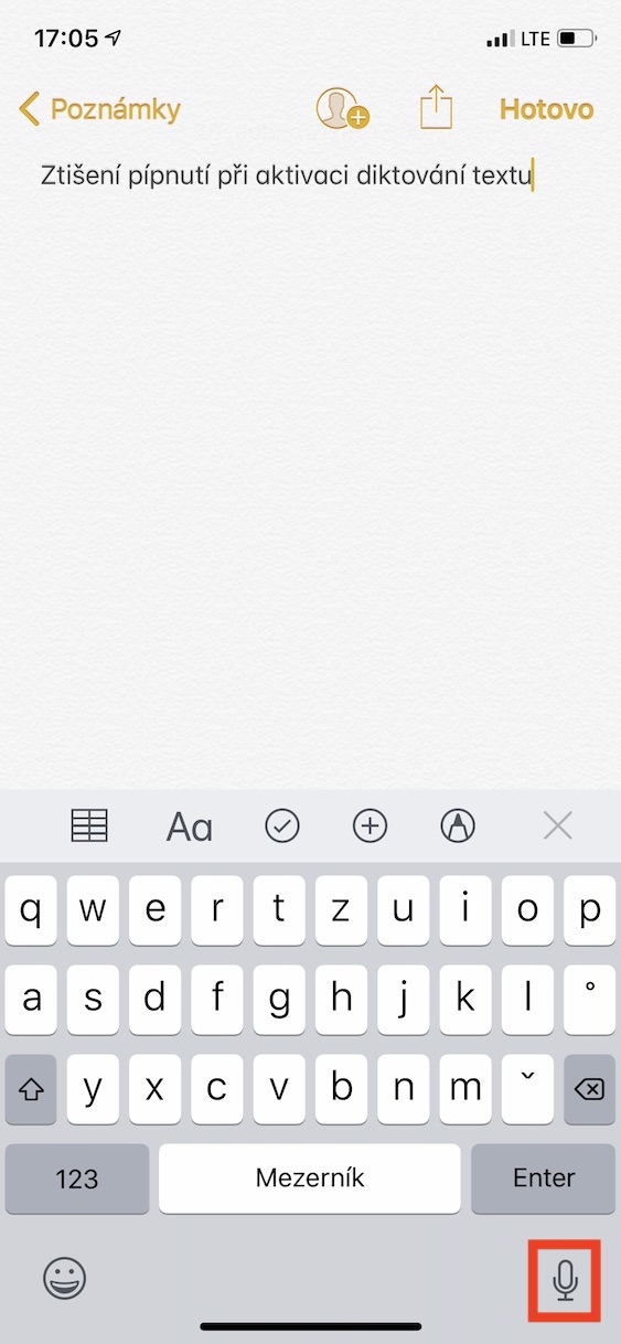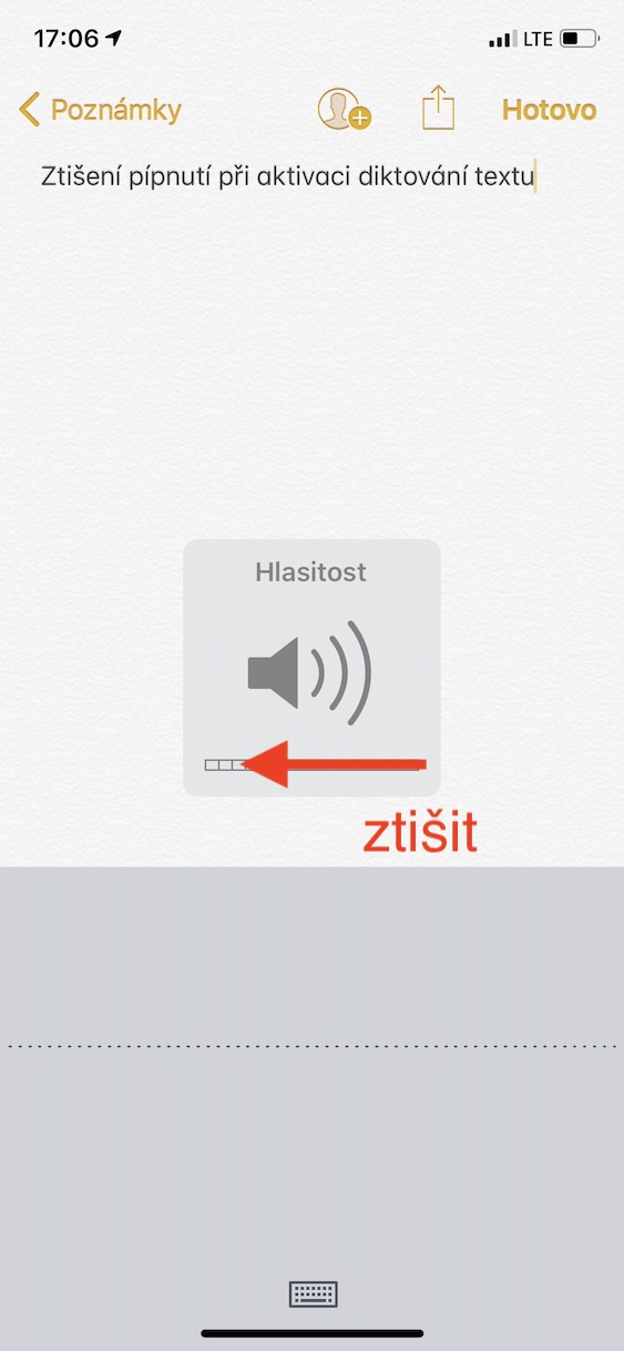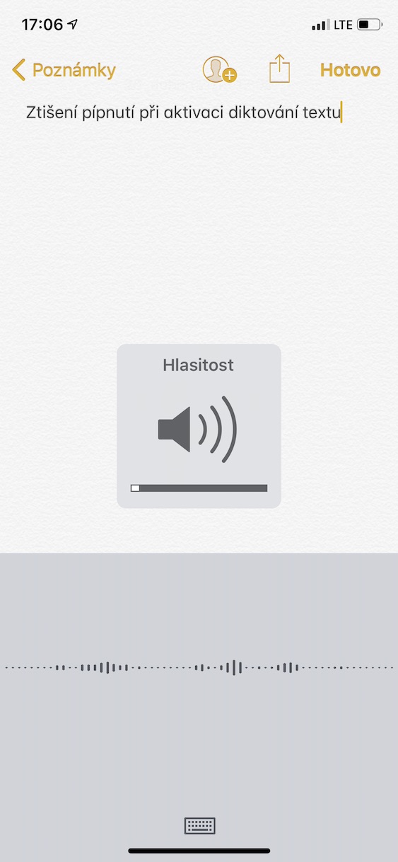 Postup je v tomto případě o mnoho jednodušší, než si myslíte. Dokonce ani nebudeme muset brouzdat někde v nastavení. Vše, co pro ztišení otravného pípnutí musíte udělat je, přesunout se do jakékoliv aplikace, kde se zobrazí klávesnice. Můžete využít například Poznámky, Messenger, Zprávy, či cokoliv jiného. Jakmile se vám na displeji zobrazí klávesnice, tak klikněte na ikonu mikrofonu, čímž aktivujete diktování textu. Funkci nechte aktivovanou a pomocí tlačítek hlasitosti na boční straně zařízení nastavte hlasitost na úplně nejnižší. Jakmile takto učiníte, tak už můžete funkci diktování vypnout. Nyní, kdykoliv stisknete ikonu mikrofonu, tak se ono pípnutí neprojeví hlasitě, ale nejtišeji, co to systém dovolí. Zvuk samozřejmě můžete stejným způsobem i zesílit.