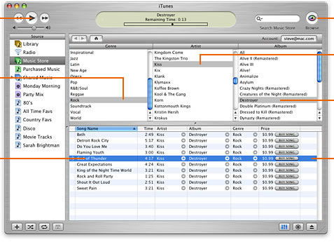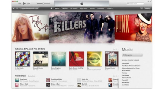 Apple stanul před nelehkým úkolem – přesvědčit hudební vydavatelství o výhodách digitální distribuce, a to v době, kdy světu stále ještě kralovaly fyzické nosiče. S největší pravděpodobností zabodovaly Jobsovy přesvědčovací schopnosti a Applu se podařilo si na svou stranu získat tehdejší velkou pětku mezi vydavatelskými společnostmi: BMG, EMI, Sony Music Entertainment, Universal Music Group a Warner Music Group. iTunes Music Store nabízel v den svého spuštění úctyhodných 200 tisíc skladeb, a tento počet se v průběhu šesti měsíců zdvojnásobil. Jako velmi strategický krok se ukázalo rozhodnutí rozdělit alba do jednotlivých skladeb.