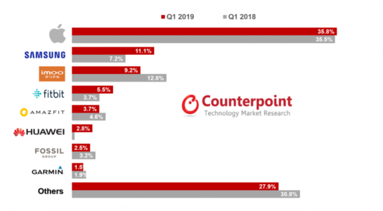 Apple sice konkrétní prodejní čísla nesdělil, netajil se však tím, že jejich prodeje opět lámaly rekordy. To potvrzuje i průzkum analytické společnosti Counterpoint, podle které byly prodeje Apple Watch o 49 % vyšší než ve stejném období vloni. I díky tomu je tak nynější podíl Apple Watch na trhu s chytrými hodinkami parádních 35,8 %, což jinými slovy znamená, že každé třetí chytré hodinky pochází z dílny Applu. Na druhém místě se umístil se svými 11,1 % Samsung, který následuje poměrně neznámá společnost imoo s 9,2 % a Fitbit s 5,5 %. Na kompletní přehled se můžete podívat v grafu pod tímto odstavcem.