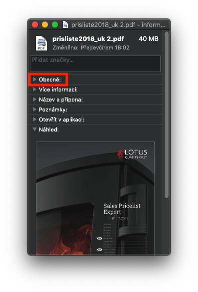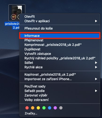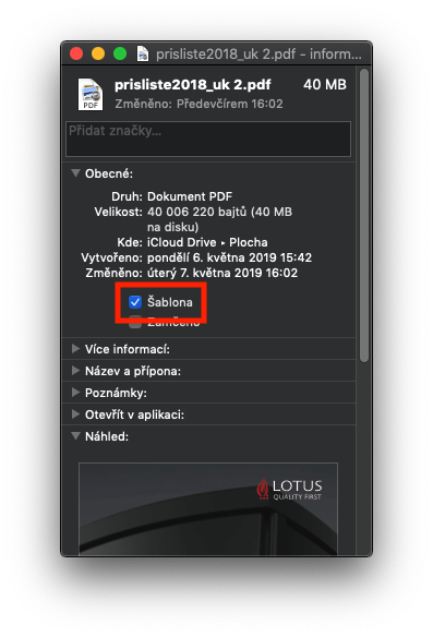 Postup je v tomto případě opravdu velice jednoduchý. Prvně si najděte soubor, který chcete jako šablonu nastavit – já jsem si pro ukázku zvolil PDF dokument. Soubor poté naklikněte pravým tlačítkem myši, popřípadě dvěma prsty na Trackpadu. Zobrazí se menu, ve kterém musíte kliknout na možnost Informace. Poté se otevře nové okno, kde pomocí malé šipečky rozkliknete sekci Obecné. Zde už poté stačí jednoduše zaškrtnout políčko Šablona.