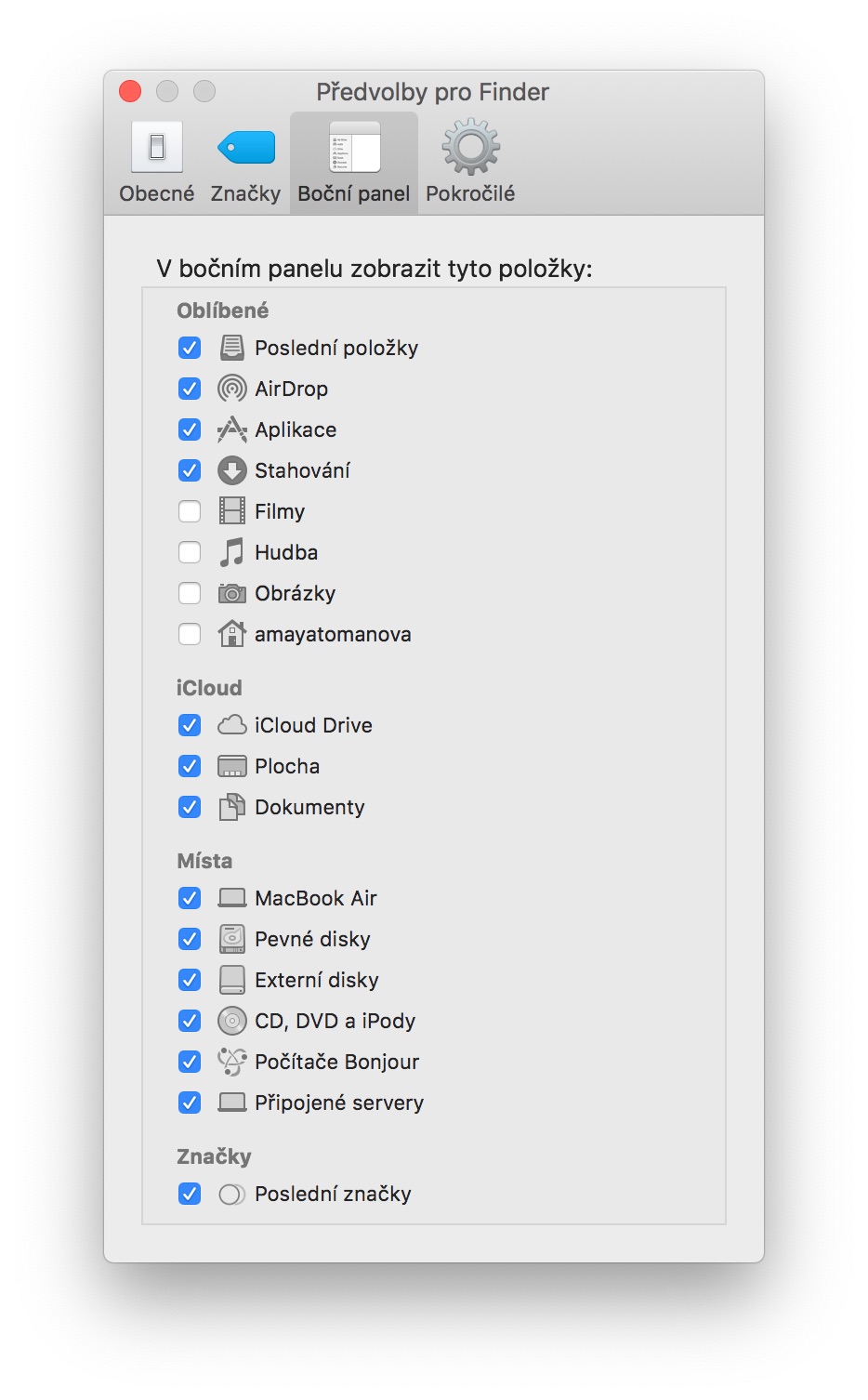 Ve Finder -> Předvolby -> Boční panel si zase můžete navolit položky a umístění, která se budou zobrazovat na boční liště Finderu.