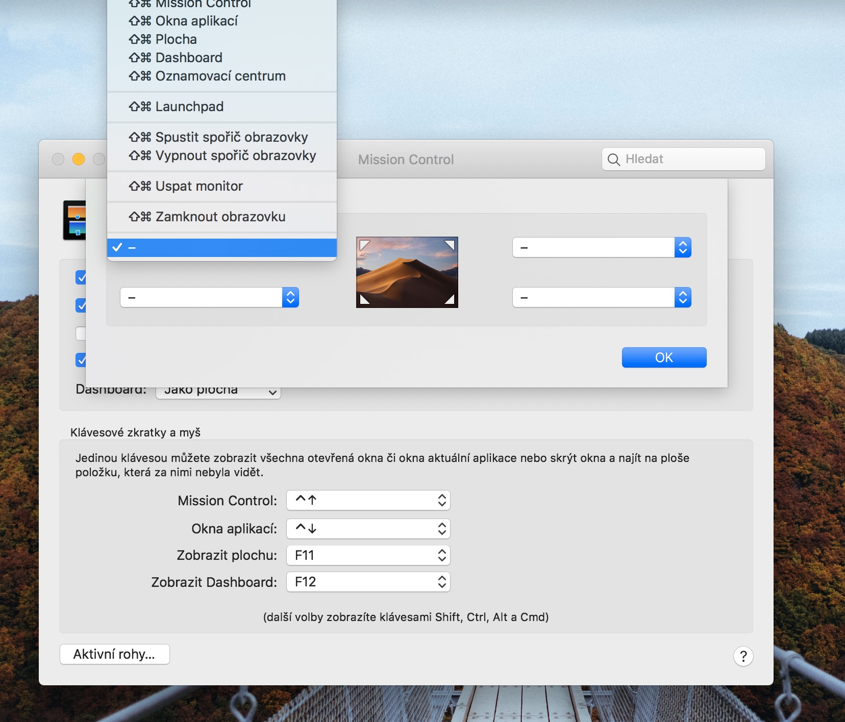 Aktivní rohy v macOS představují rychlé zkratky pro různé akce na Macu, jako je spuštění spořiče obrazovky, uzamčení obrazovky a řada dalších.  Aktivním rohům můžete jejich jednotlivé funkce přiřadit po kliknutí na ikonku Apple v levém horním rohu obrazovky vašeho Macu -> Předvolby systému -> Mission Control, kde v levém dolním rohu okna kliknete na „Aktivní rohy“. Pokud se bojíte, že funkce aktivních rohů spustíte nechtěně, držte při volbě akcí stisknuté tlačítko Command – nastavíte tím spuštění akce za současného držení příslušné klávesy.