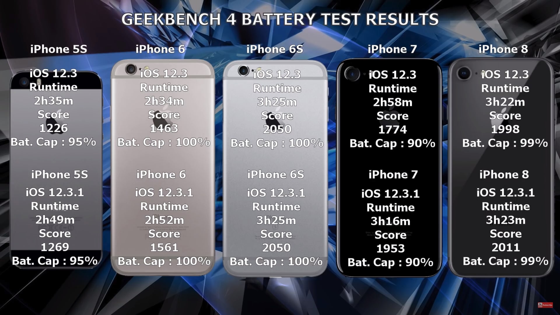 Pro testování byla použita známá aplikace Geekbench, kterou všichni můžeme znát jakožto program pro zjišťování výkonu. Aplikace však zvládne i změřit výdrž baterie a poskytne uživateli podobně detailní informace o samotné výdrži. Jak již bylo zmíněno, výdrž se navýšila pouze nepatrně. U iPhonu 8 jde o jednu minutu, iPhonu 6 a 7 o 18 minut, iPhonu 5S o 14 minut a iPhone 6S si bohužel nikterak nepřilepšil. Ačkoliv nejde o nějaké extra zlepšení, uživatelé starších jablečných telefonů je budou moci užít o trošku déle.